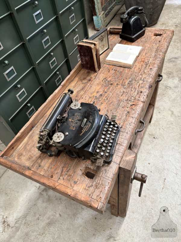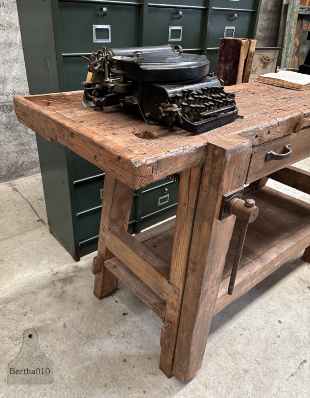 Deze prachtig bewaarde, massief wat kortere houten werkbank met dik blad komt rechtstreeks uit een oude timmermansschool in Roeselaar, waar generaties vaklieden hun eerste fijne houtverbindingen leerden maken. Je voelt het meteen: dit is geen meubel, dit is een verhaal.