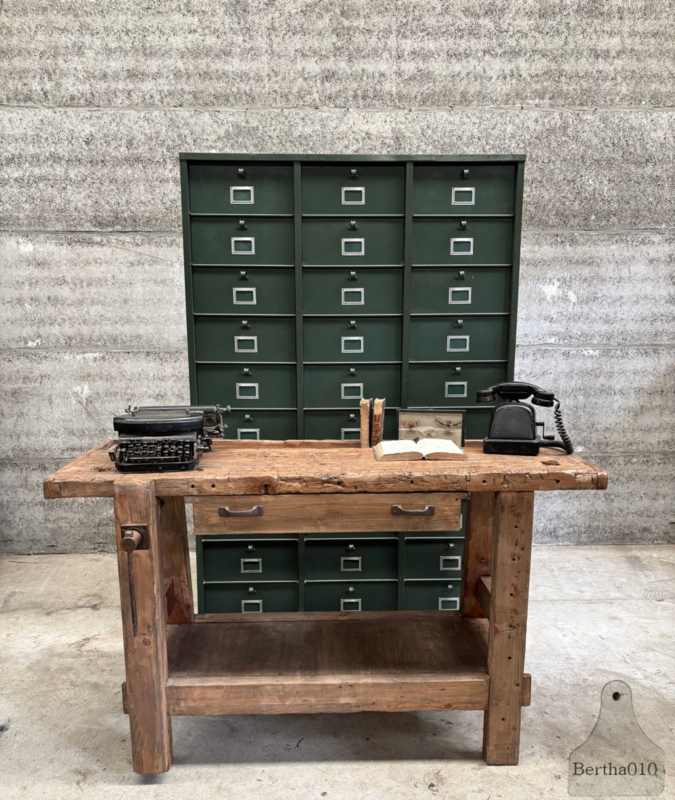 Ideaal als stijlvol badkamermeubel met waskom, als uniek dressoir in de woonkamer of als karaktervol element in een landelijke keuken. Deze werkbank laat zich moeiteloos inpassen in diverse interieurs – van industrieel tot rustiek – en brengt altijd een verhaal met zich mee.