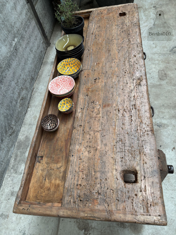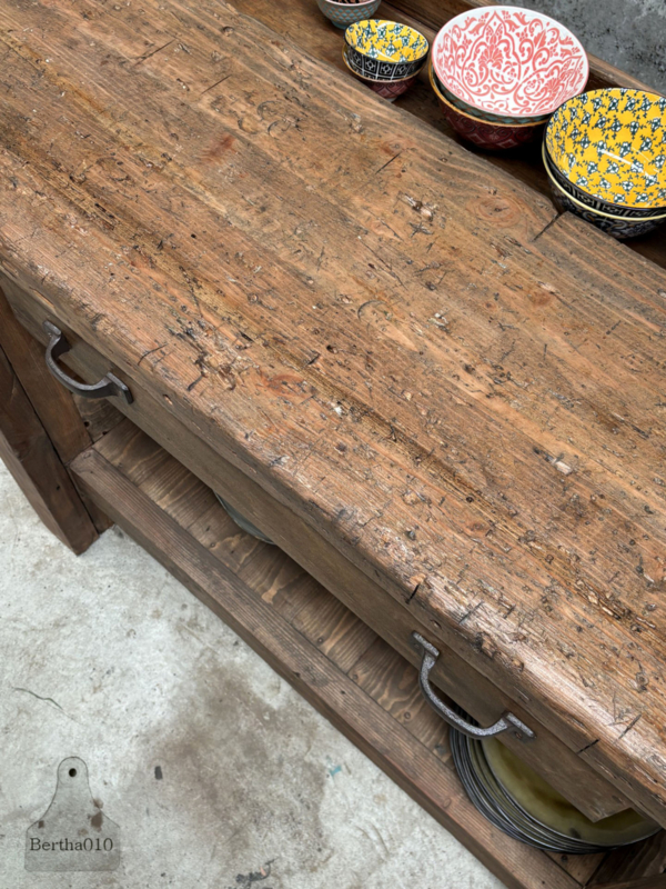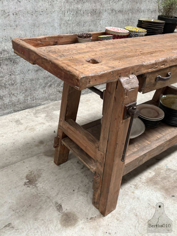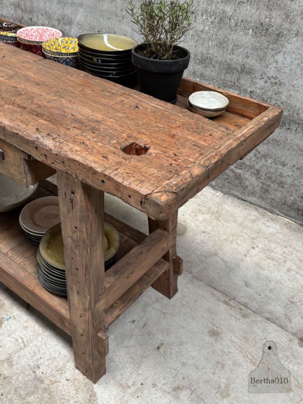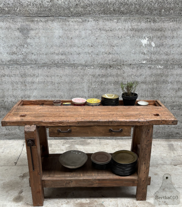 Ideaal als stijlvol badkamermeubel met waskom, als uniek dressoir in de woonkamer of als karaktervol element in een landelijke keuken. Deze werkbank laat zich moeiteloos inpassen in diverse interieurs – van industrieel tot rustiek – en brengt altijd een verhaal met zich mee.