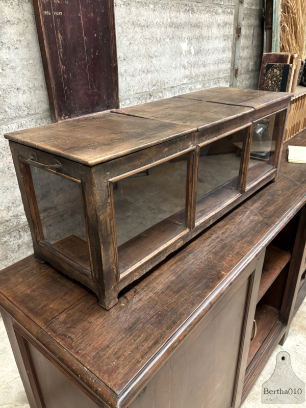 De kast is laag van formaat, rust op elegante pootjes, en is aan drie zijden voorzien van glas voor optimale zichtbaarheid van de inhoud. Aan de bovenzijde bevinden zich drie originele kleppen met prachtige, authentieke handgrepen – volledig functioneel en in originele staat.