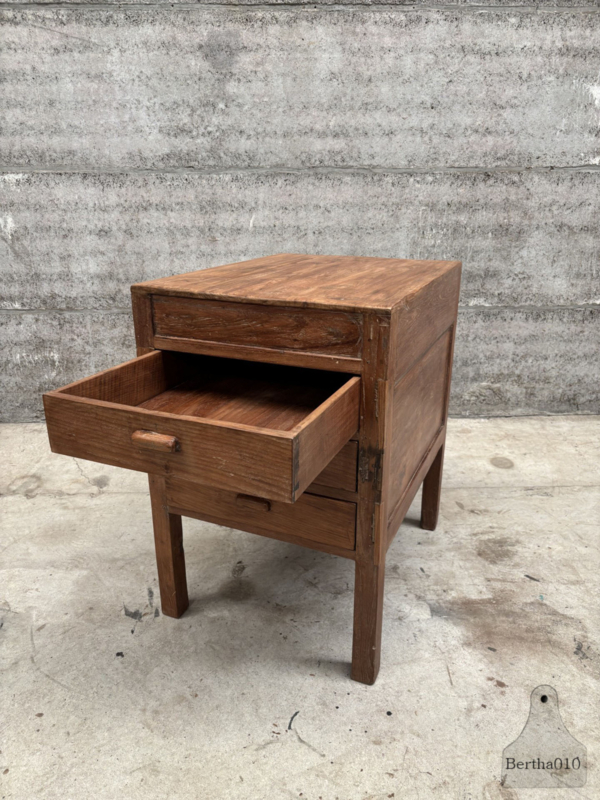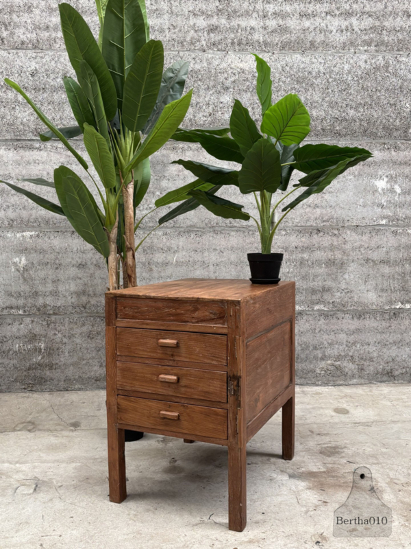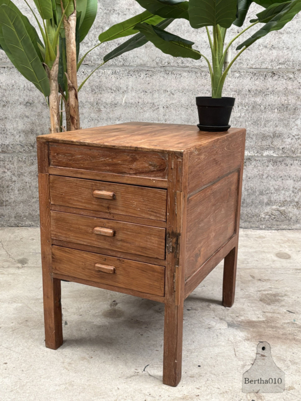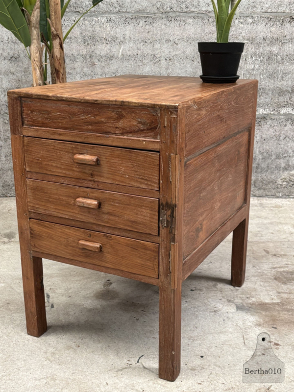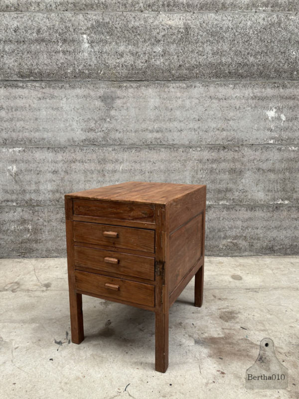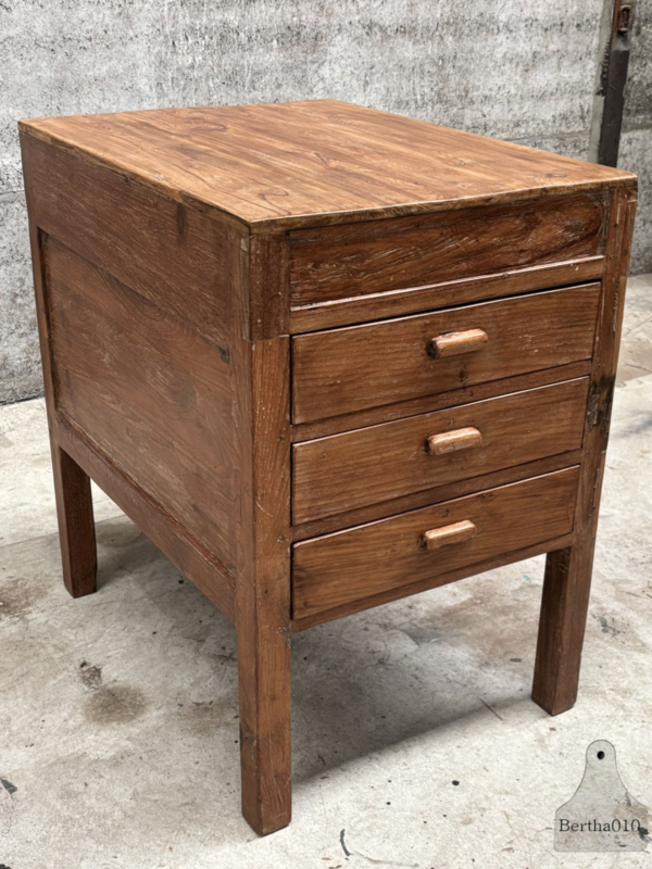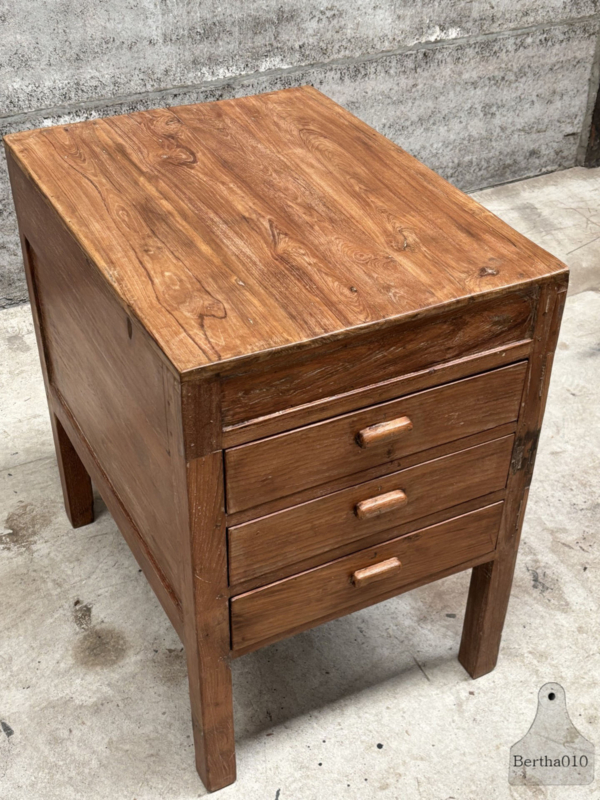 OverzichtUniek houten keukenblok uit een restaurant uit de jaren 1920/30. Gemaakt voor intensief gebruik en met liefde doorleefd. Het blok staat hoog op sierlijke, stevige poten en heeft drie royale, soepel lopende lades – ideaal voor keukengerei, linnen of voorraad.