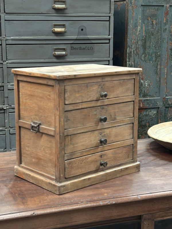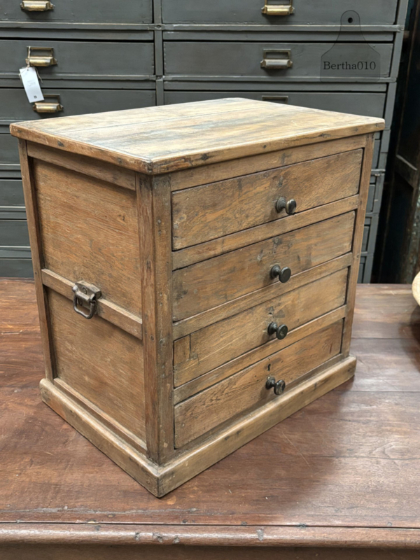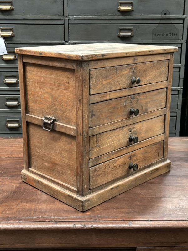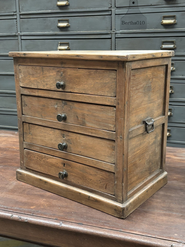 Dit houten ladekastje, afkomstig uit een oud atelier, is een tijdloos meubel met karakter. Het kastje verkeert in perfecte staat en is de ideale mix van praktische functionaliteit en authentiekheid. De kast heeft vier ruime lades en is afgewerkt met oude ijzeren handgrepen, wat het meubel een stoere en authentieke uitstraling geeft.