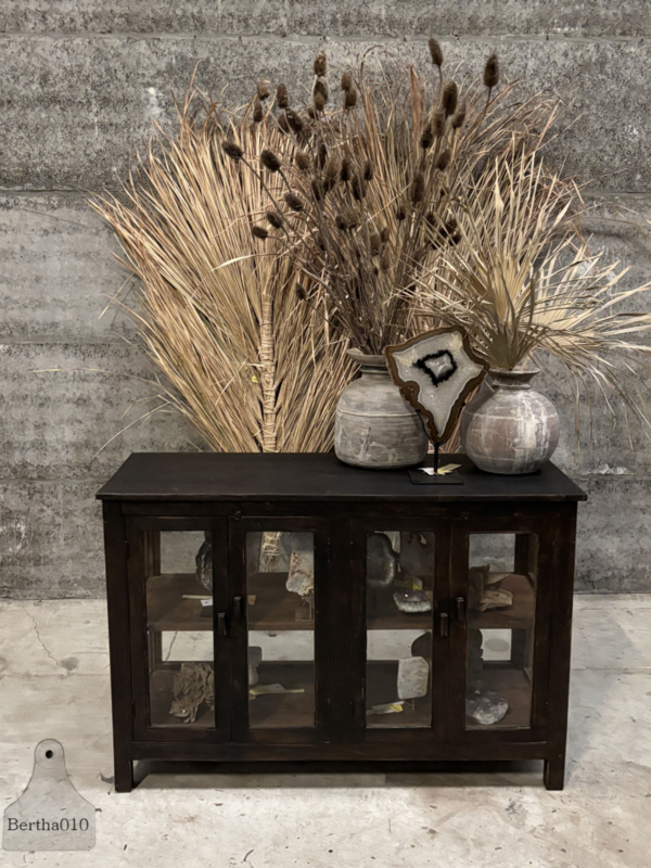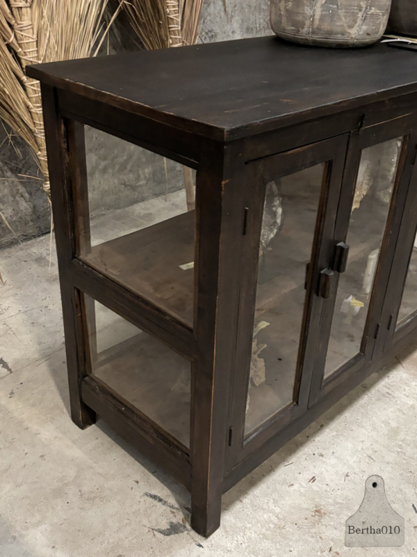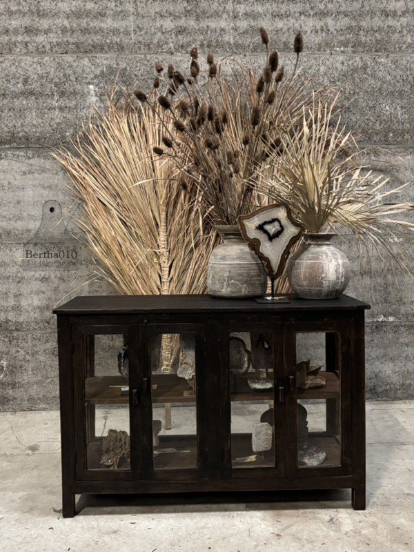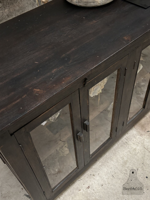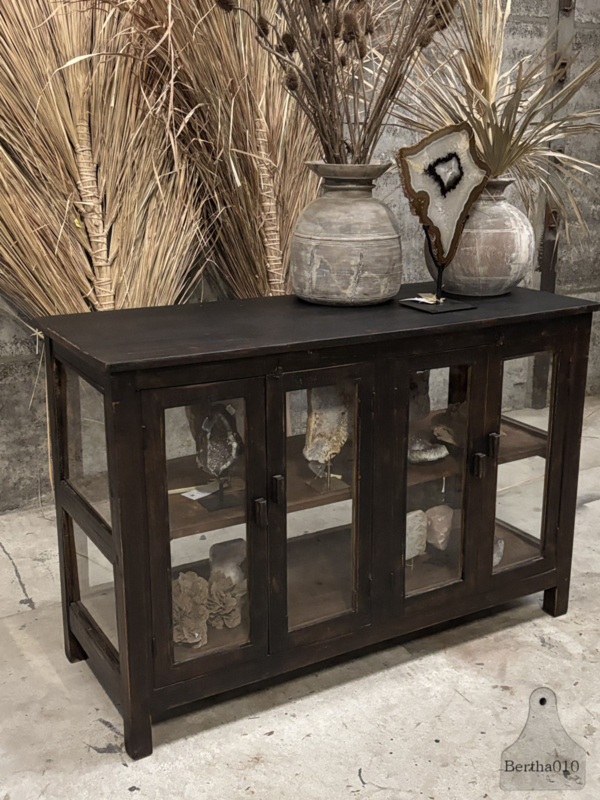Het glas rondom laat servies, voorraadpotten, kookboeken of bijzondere objecten prachtig zien. De twee ruime, soepel schuivende deuren bieden volop opbergruimte. Dankzij de prettige werkhoogte functioneert deze vitrine perfect als keukenwerkplek of als karaktervol kookeiland.