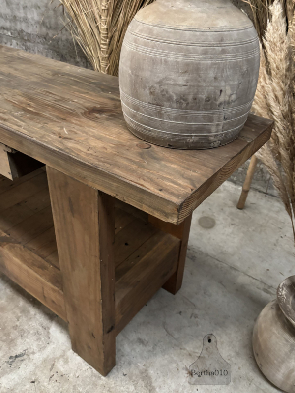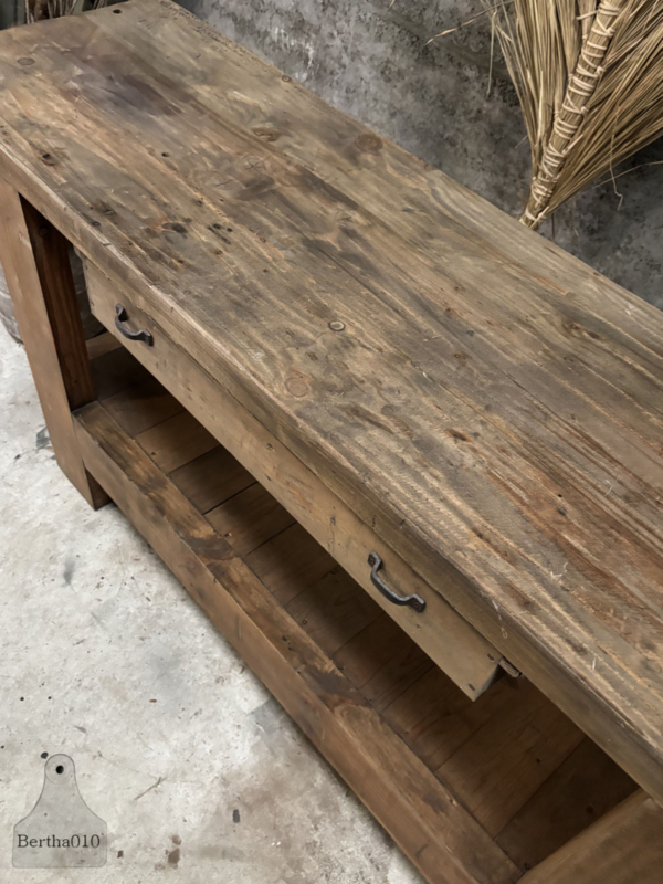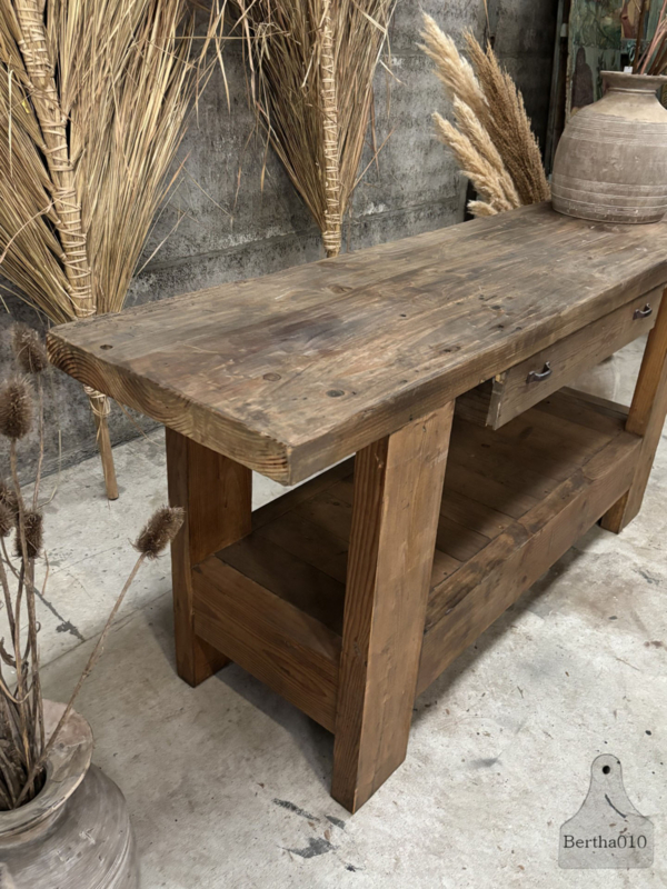 OverzichtUniek en doorleefd: deze oude werkbank van grenen komt uit een oud timmermansatelier in België en is een prachtig voorbeeld van vakmanschap. Het robuuste werkblad – vol karakter en historie – maakt dit meubel tot een echte blikvanger.