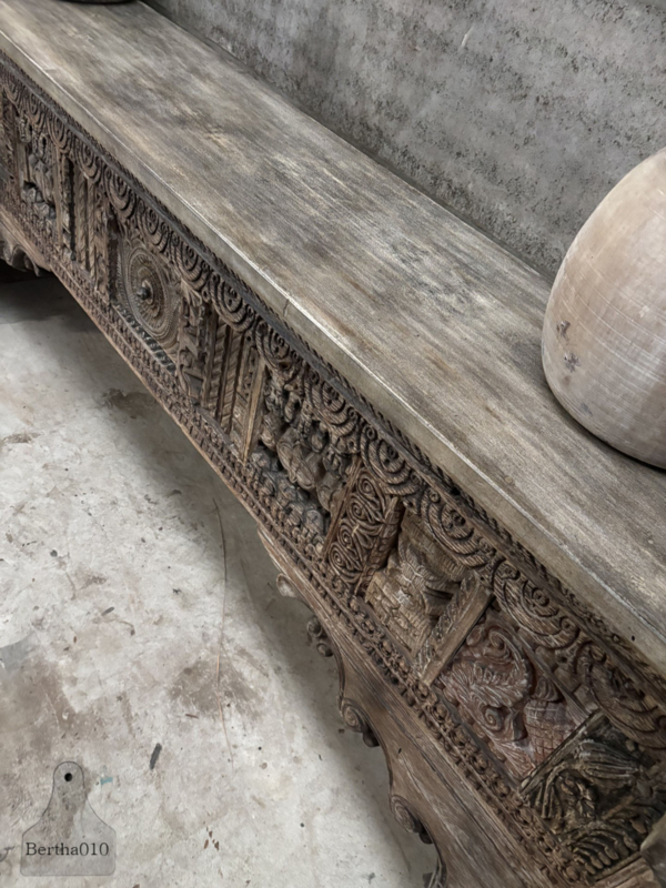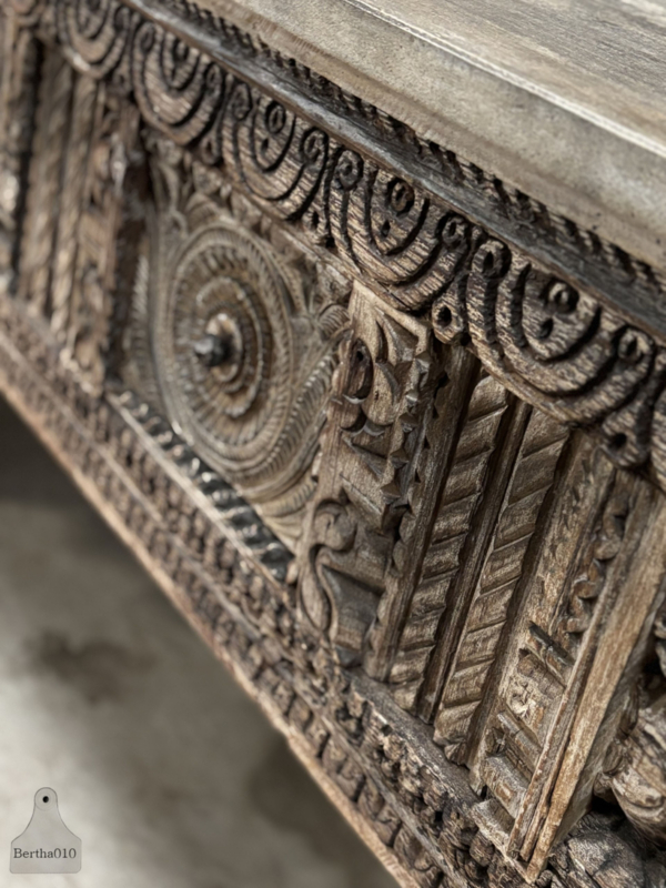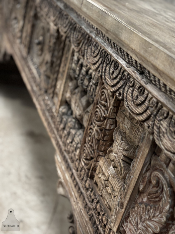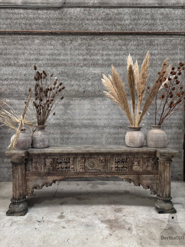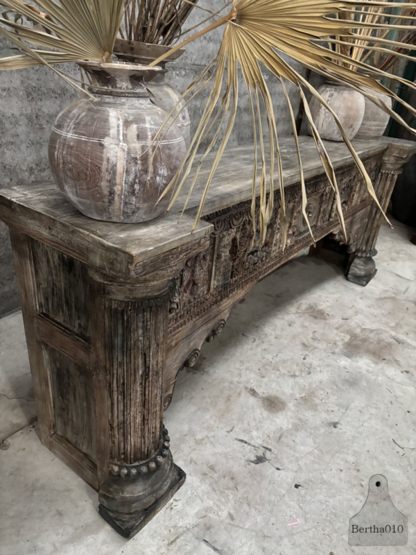 OverzichtDeze bijzondere houten sidetable is vervaardigd uit authentieke houten panelen die vaak honderden jaren oud zijn. Elk paneel is rijkelijk versierd met traditioneel Indiaas houtsnijwerk, waarbij vakmanschap, spiritualiteit en geschiedenis samenkomen in één uniek meubelstuk.