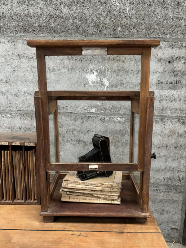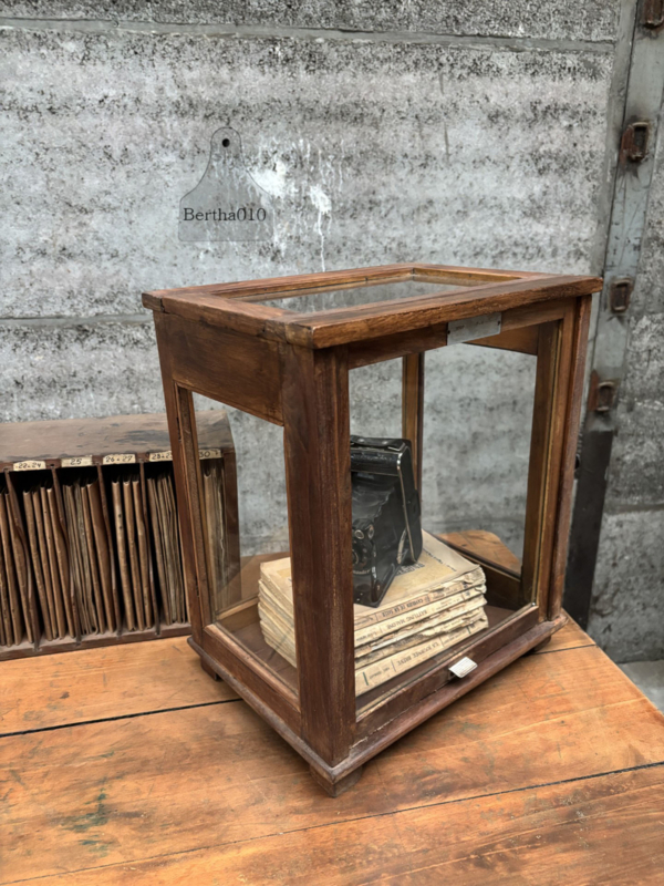Het heeft een robuuste, industriële uitstraling die vaak gepaard gaat met het gebruik van houten frames en veel glas, wat het ideaal maakte voor het tonen van objecten in een veilige en goed zichtbare manier