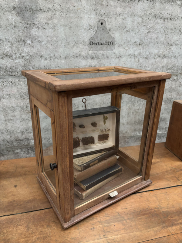 Dit type vitrine werd vaak gebruikt in laboratoria en apotheken om waardevolle of fragiele instrumenten, chemicaliën of specimens tentoon te stellen en heeft een schuifdeur aan de voorzijde.