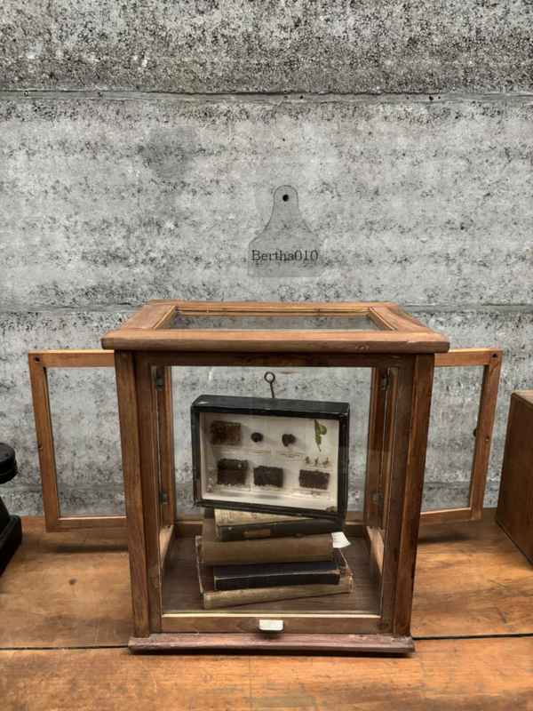 Het heeft een robuuste, industriële uitstraling die vaak gepaard gaat met het gebruik van houten frames en veel glas, wat het ideaal maakte voor het tonen van objecten in een veilige en goed zichtbare manier