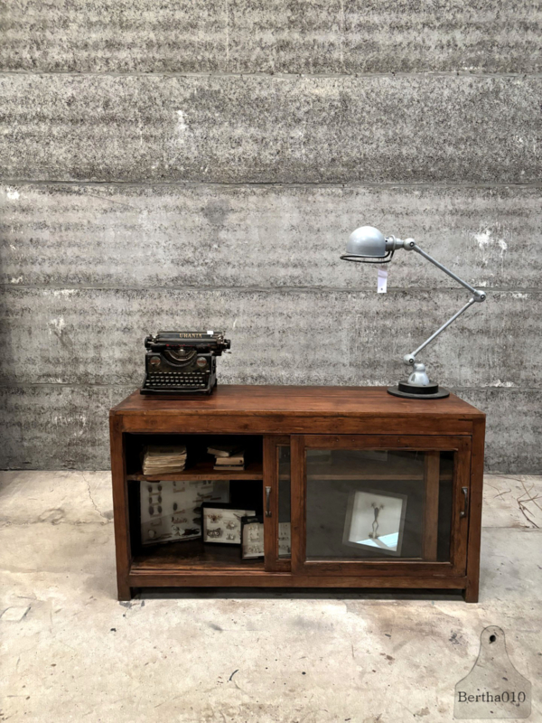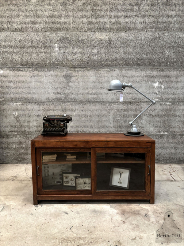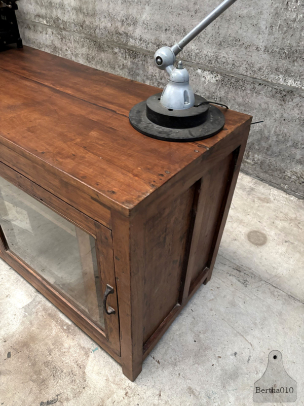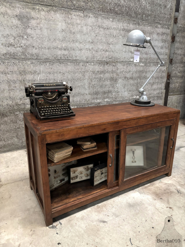De kast beschikt over twee grote, soepel lopende schuifdeuren met prachtig gebogen oud glas, voorzien van stoere, originele handgrepen die het authentieke karakter extra benadrukken.