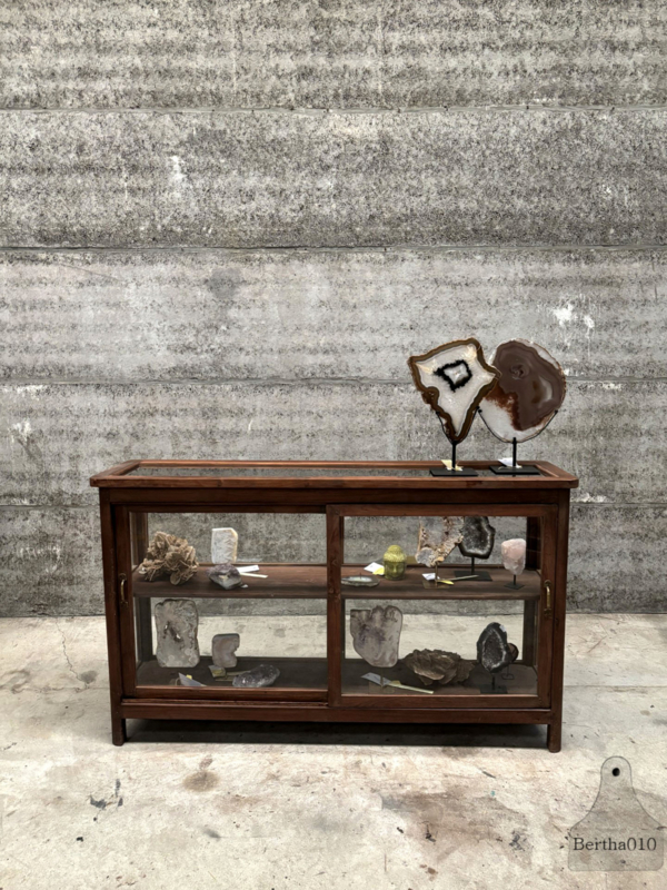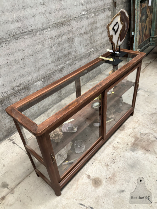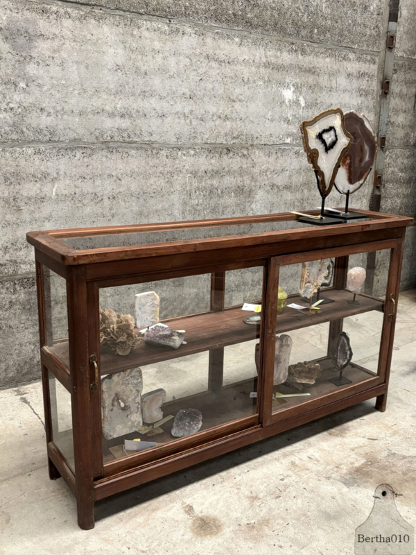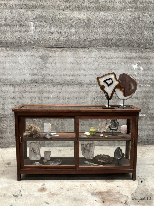 Oorspronkelijk deed dit meubel dienst als winkelvitrine – een plek waar producten uitgestald én verkocht werden. De glazen zijden fungeerden als vitrine, de achterkant bood toegang tot voorraad. Gemaakt met het oog op duurzaamheid en dagelijks gebruik, door vakmensen die bouwden voor de lange termijn.