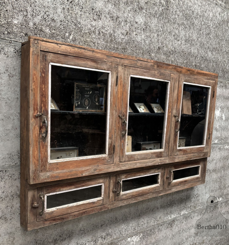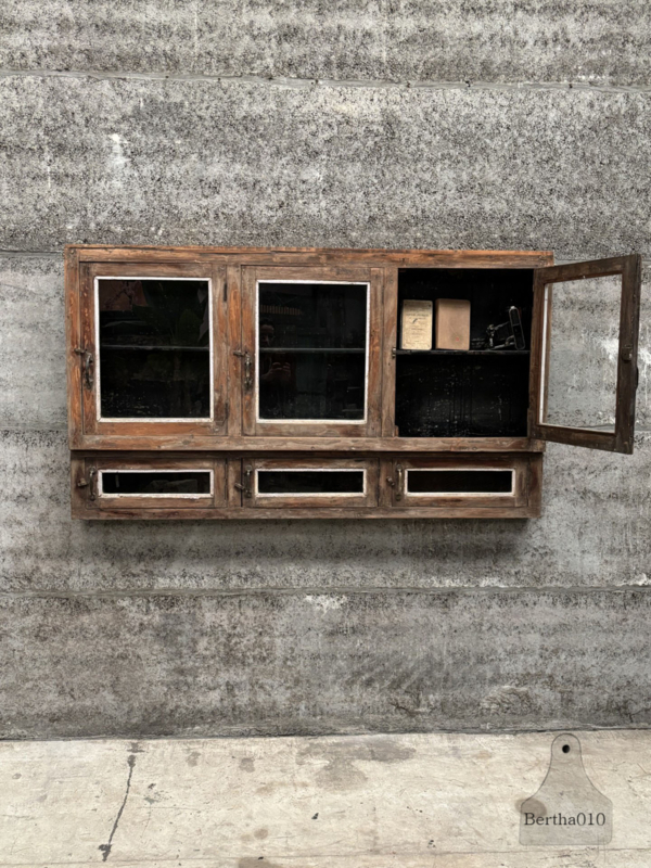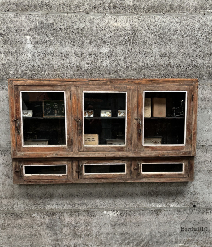 De vitrine is voorzien van drie glazen deuren aan de bovenzijde en daaronder drie kleinere glazen deurtjes, allemaal uitgerust met stoere, originele handgrepen die het authentieke karakter benadrukken.