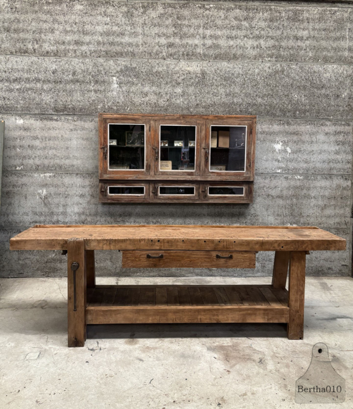 Deze eiken werkbank komt uit een oude timmerwerkplaats en dateert uit de vroege 20e eeuw. Gemaakt door lokale meubelmakers die hun werk zagen als een ambacht, niet als productie. Elk gat, krasje en inkeping draagt bij aan het unieke karakter van het meubel.