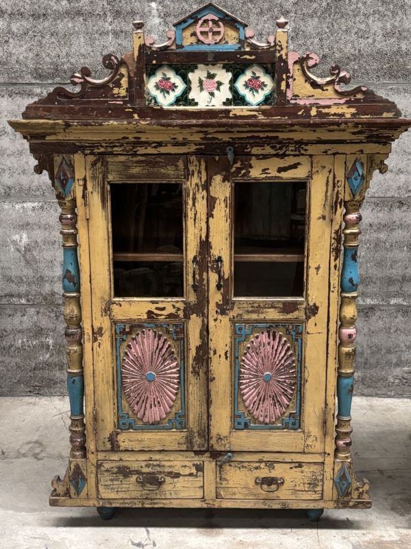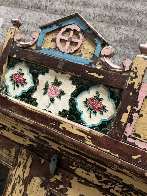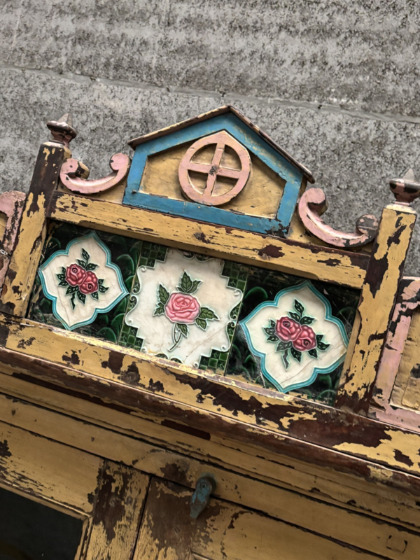 De keramische bloemtegeltjes bovenin, met hun verfijnde rozenmotief en subtiele craquelé, vertellen het verhaal van traditioneel vakmanschap en geven de kast een bijna poëtische uitstraling.