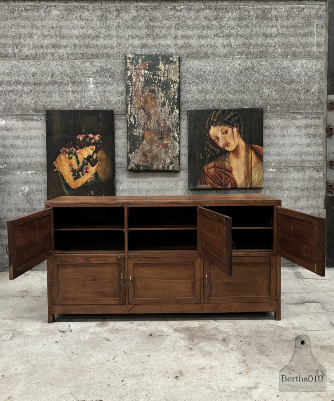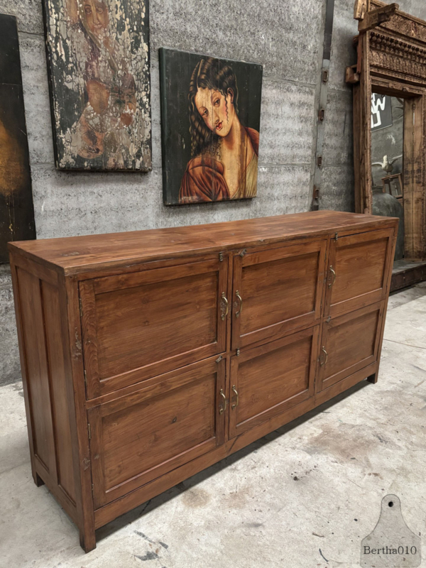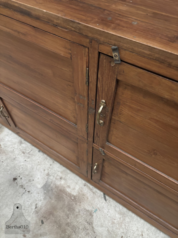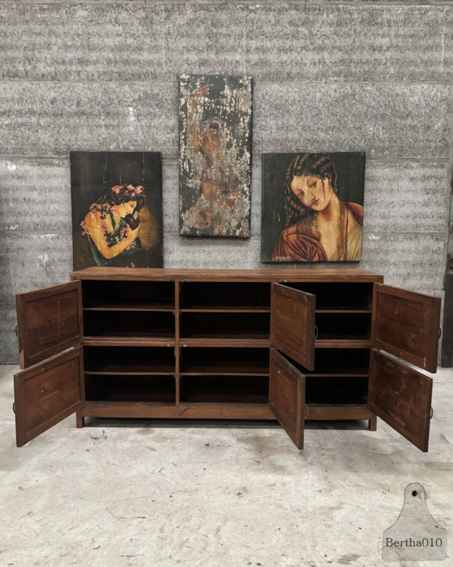 Het meubel is vervaardigd uit prachtig massief hout en toont een diepe, natuurlijke patina die alleen door jarenlang intensief gebruik kan ontstaan. De kast beschikt over zes soepel lopende deuren, elk voorzien van een originele sluiting en authentieke handgrepen, wat het industriële en functionele karakter extra benadrukt.