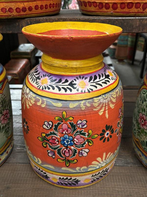 Plaats deze prachtige houten handbeschilderde pot in je interieur en ervaar hoe hij de ruimte vult met een gevoel van zeldzaamheid.