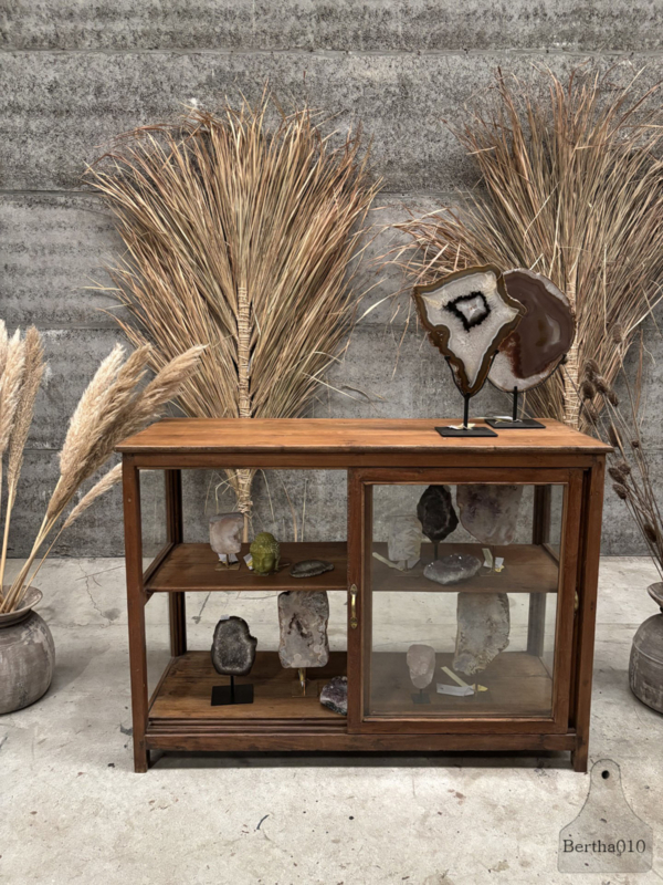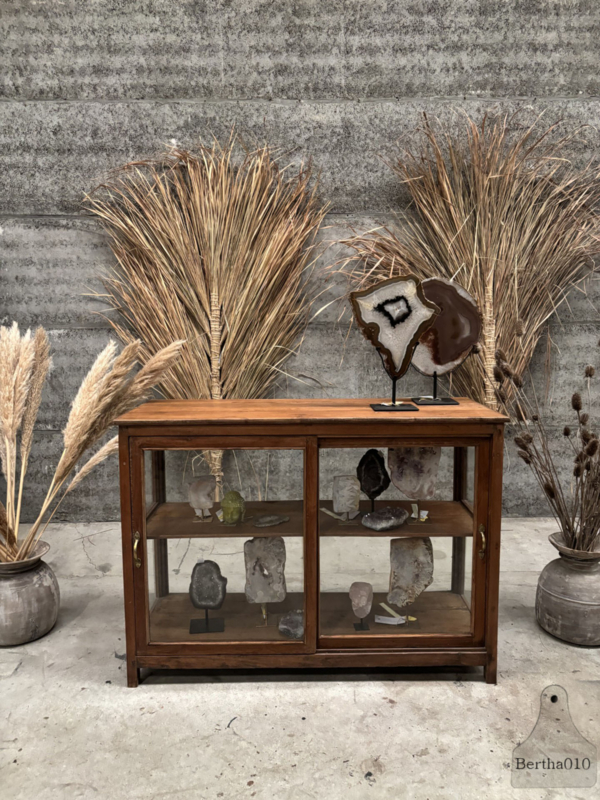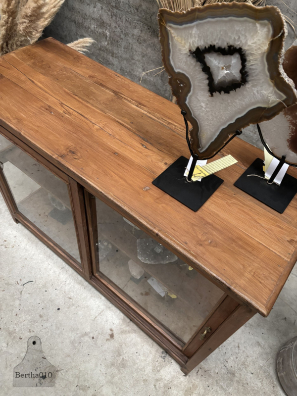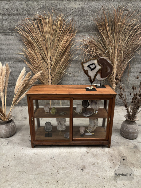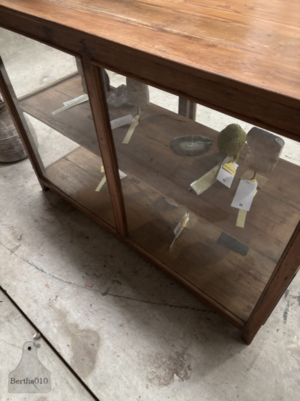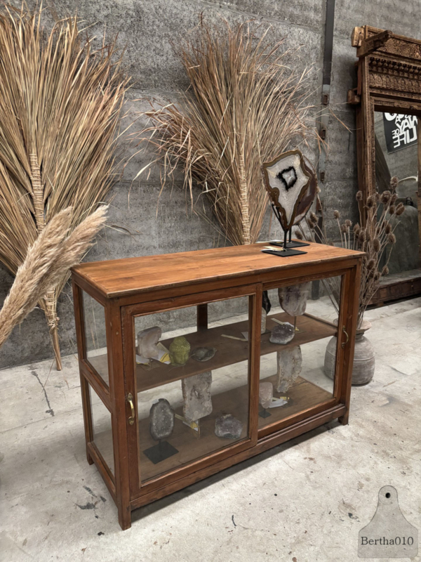 OverzichtDeze authentieke vitrine met glas aan alle vier de zijden en goedlopende schuifdeuren is een bijzonder item met een verhaal.