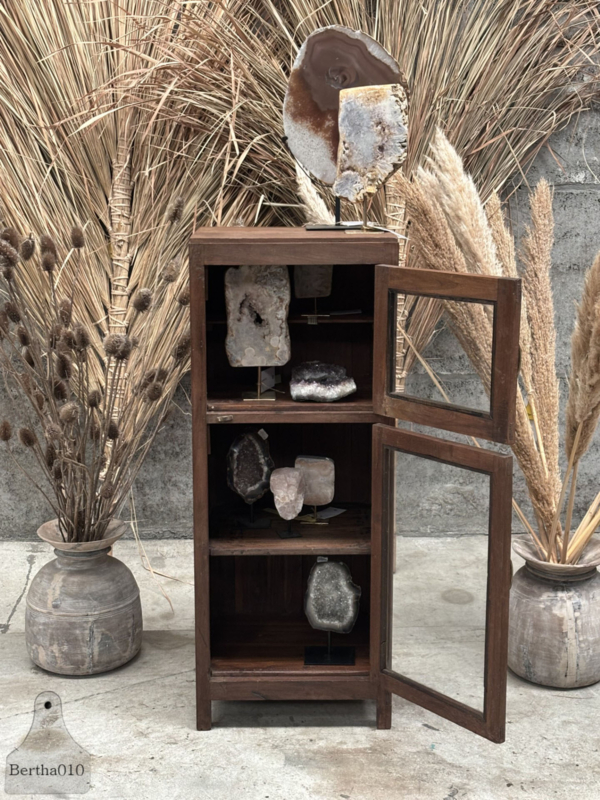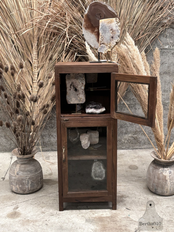 OverzichtSmal, elegant vitrinekastje op sierlijke pootjes, perfect om je mooiste spullen stijlvol tentoon te stellen zonder veel ruimte in te nemen.
