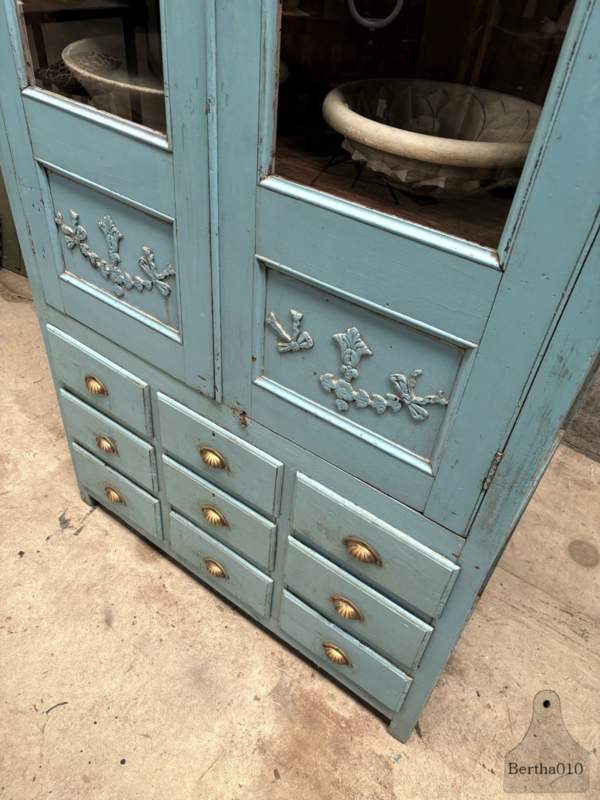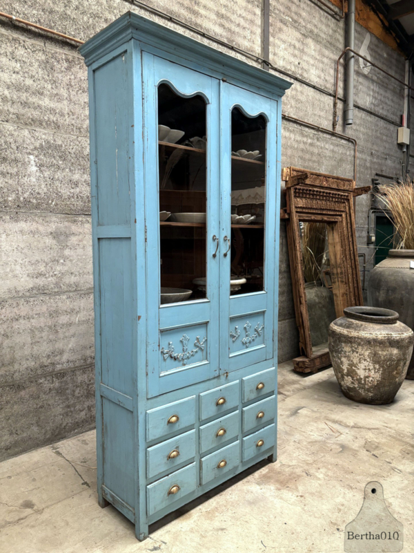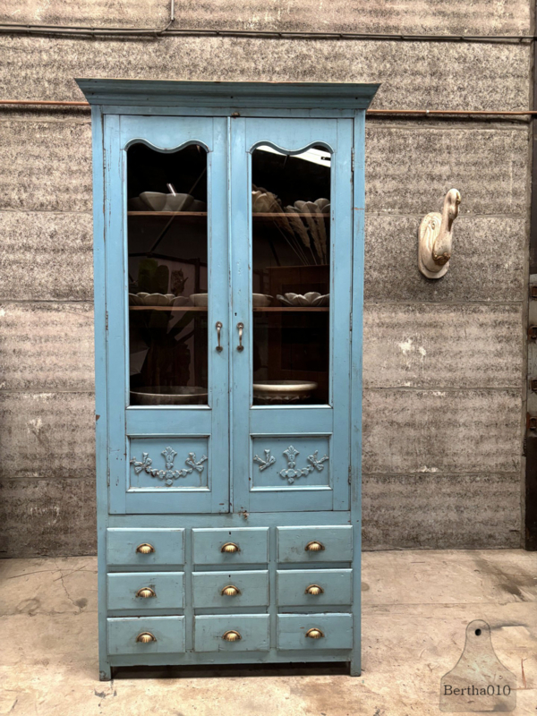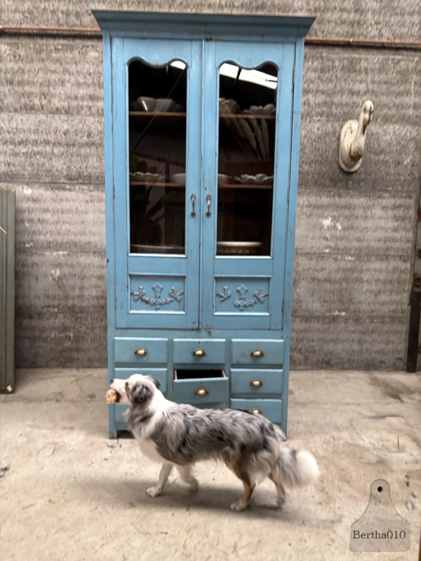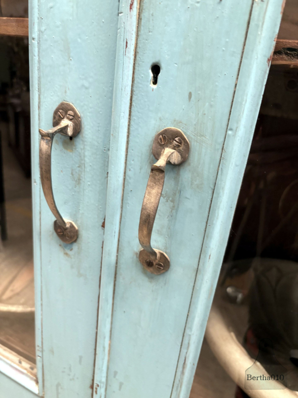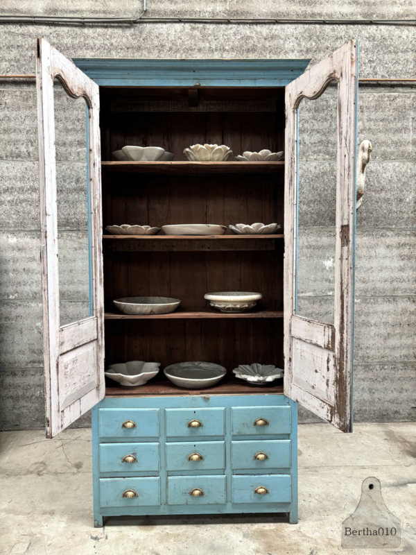 Deze kast is ambachtelijk vervaardigd uit massief hout en opgebouwd uit één geheel. De vormgeving is functioneel en evenwichtig, met oog voor detail in de verhoudingen en de originele handgrepen. De combinatie van gesloten opbergruimte en vitrinedeel maakt het een bijzonder praktisch meubel.
