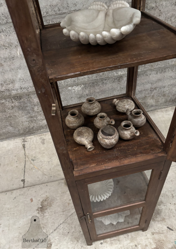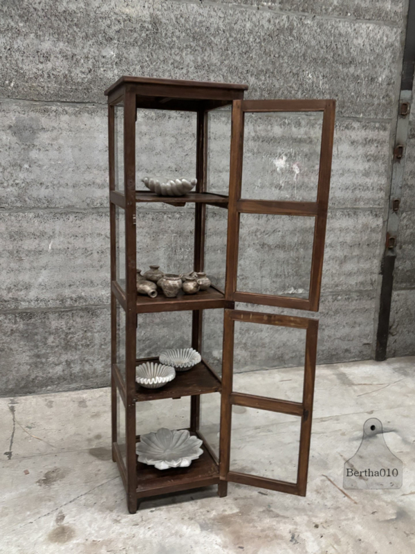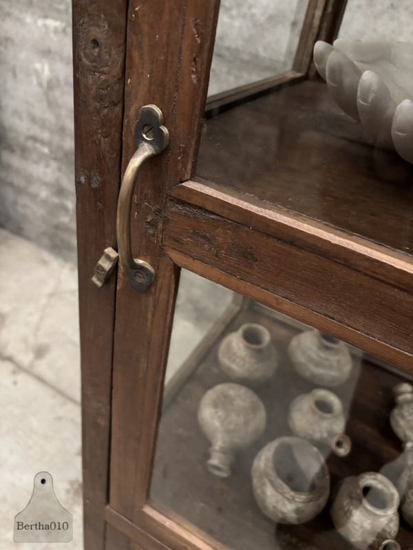 Aan alle vier de zijden voorzien van authentiek oud, licht gebobbeld glas, waardoor het daglicht op een zachte en sfeervolle manier wordt gebroken. Het glas geeft niet alleen zicht op de inhoud, maar voegt ook die typische charme toe die alleen oud glas bezit.
