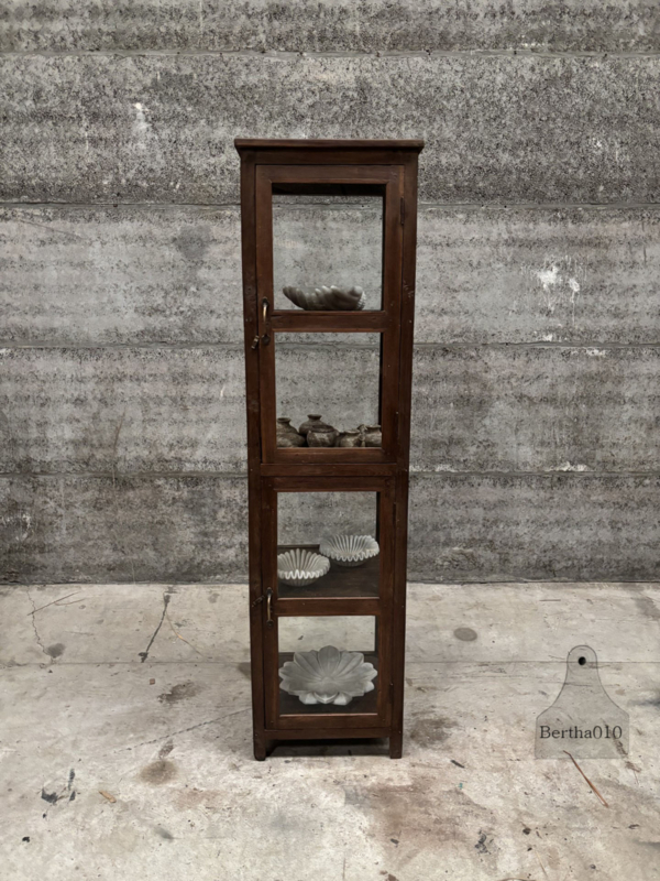 Deze kast vond haar oorsprong in een Engelse winkel uit de jaren 1920, 1930, een tijd waarin presentatie en functionaliteit zorgvuldig samenkwamen. Winkeliers gebruikten dit type vitrinekast om hun waren overzichtelijk, beschermd en aantrekkelijk te tonen.