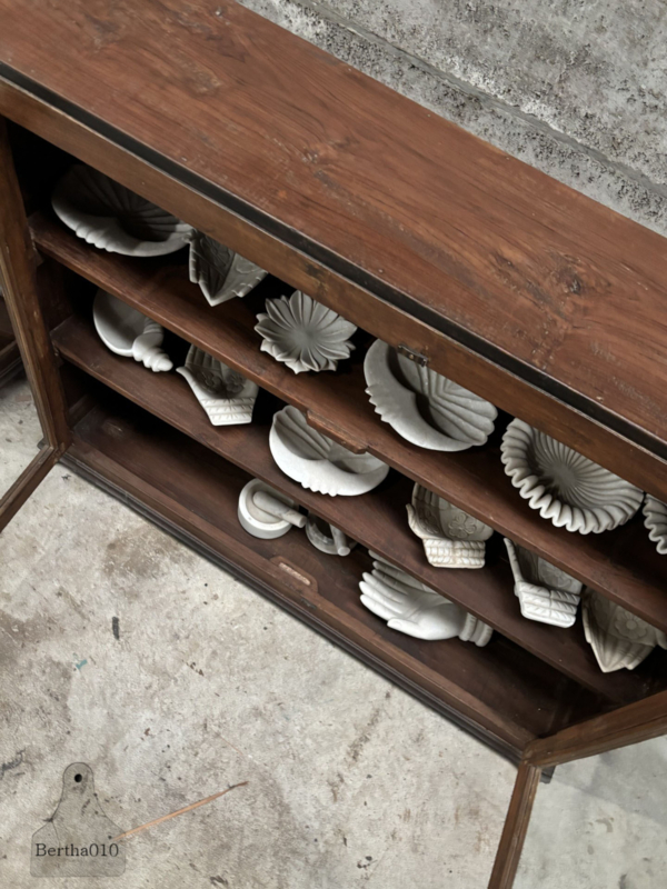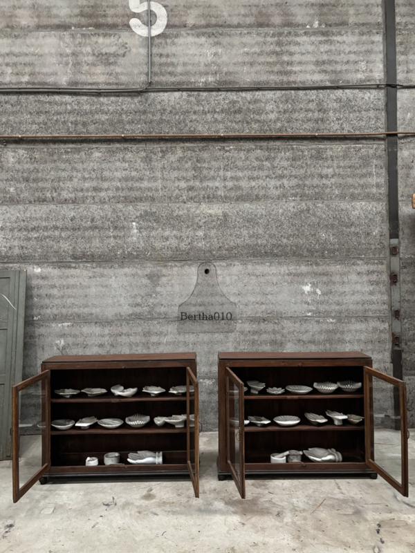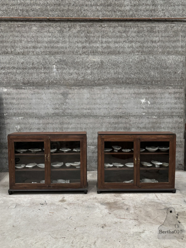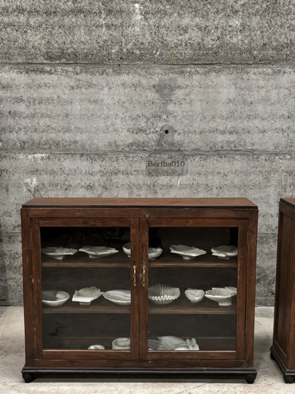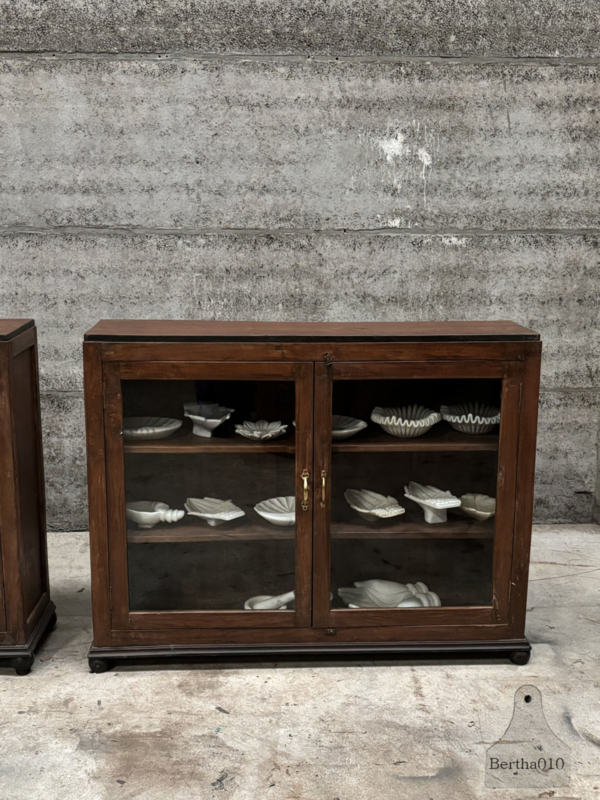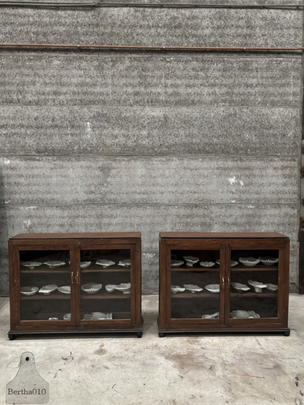 Door de jaren heen hebben de vitrines een prachtige, authentieke patina ontwikkeld, een warme, natuurlijke uitstraling die alleen ontstaat door langdurig gebruik. Ze zijn vervaardigd door ambachtelijke meubelmakers die werkten met hardhout, traditionele houtverbindingen en een scherp oog voor detail en duurzaamheid.