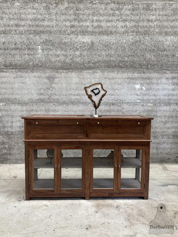 Dit karaktervolle meubel stamt uit begin 20e eeuw en werd gebruikt in een apotheek, juwelierszaak of kruidenierswinkel voor het stijlvol presenteren van bijzondere artikelen of het uitstallen van een meuseumcollectie.