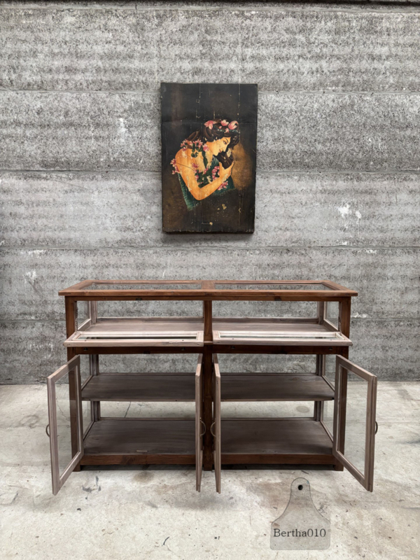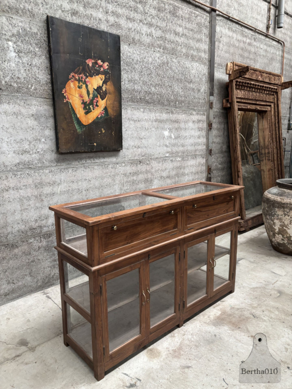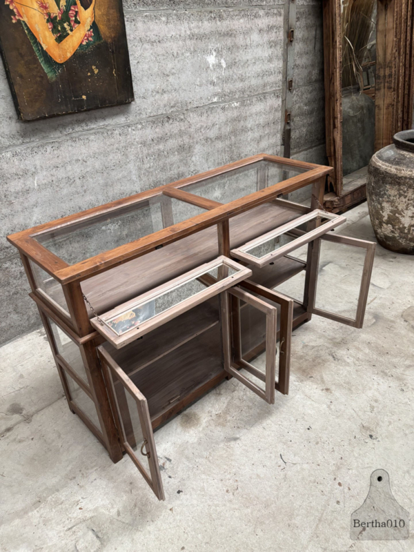 Dit karaktervolle meubel stamt uit begin 20e eeuw en werd gebruikt in een apotheek, juwelierszaak of kruidenierswinkel voor het stijlvol presenteren van bijzondere artikelen of het uitstallen van een meuseumcollectie.
