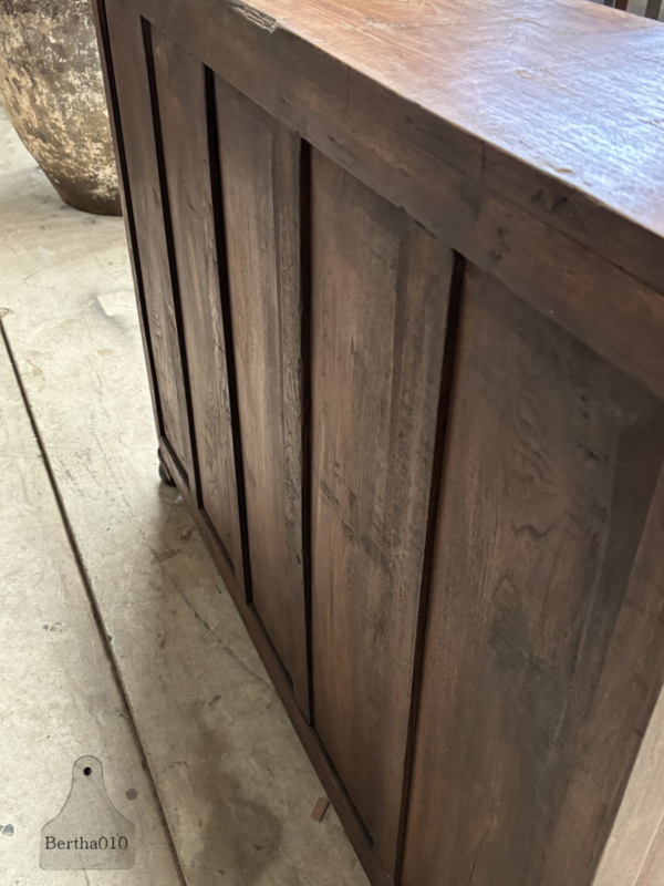 Het hout heeft in de loop der jaren een warme, natuurlijke patina ontwikkeld, een uitstraling die alleen ontstaat door langdurig gebruik. Het meubel is gemaakt door ambachtslieden die werkten met massief hout en traditionele verbindingen, bedoeld voor dagelijks gebruik in winkels en ateliers.