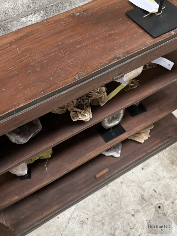 OverzichtDeze houten vitrine ademt de sfeer van een vroege 20e-eeuwse winkel. Ooit stond zij in een zorgvuldig ingericht interieur waar aandacht, ambacht en presentatie centraal stonden.
