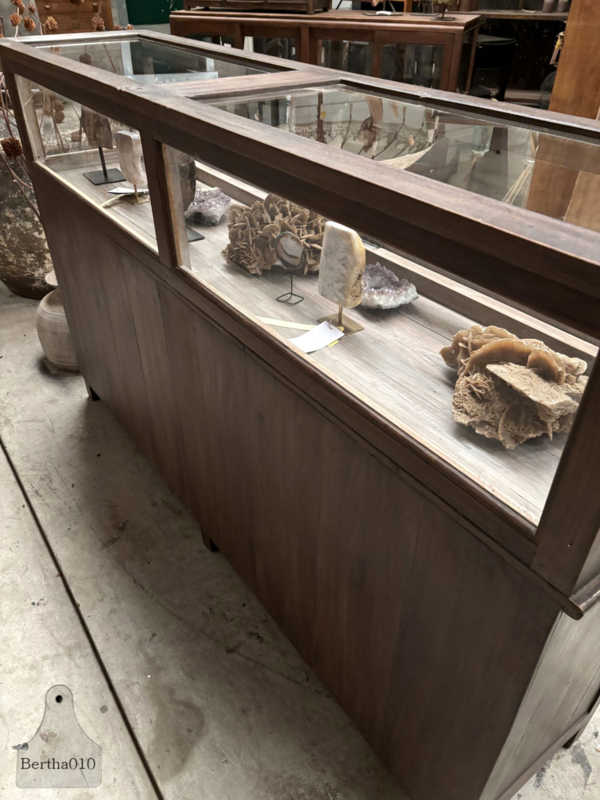 OverzichtPrachtige originele houten winkel of museumvitrine met rondom glas en een glazen bovenblad.