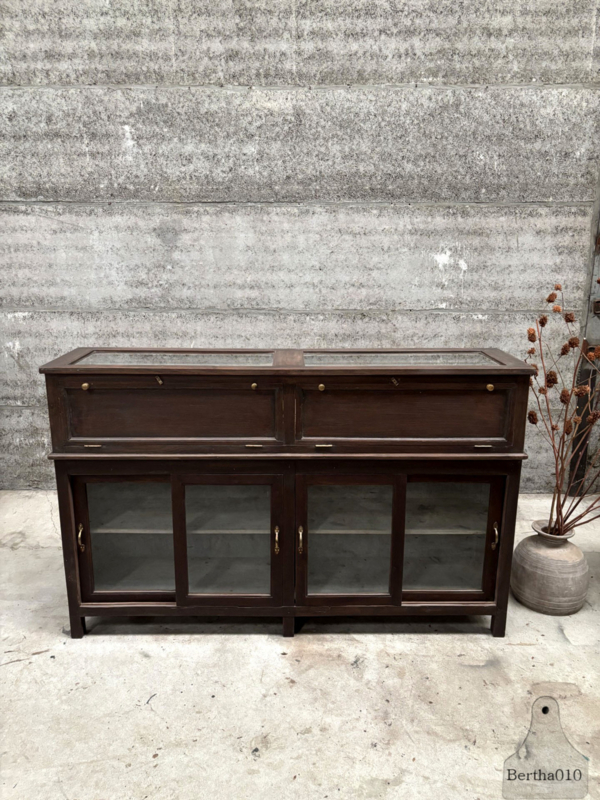Dit karaktervolle meubel stamt uit begin 20e eeuw en werd gebruikt in een apotheek, juwelierszaak of kruidenierswinkel voor het stijlvol presenteren van bijzondere artikelen of het uitstallen van een meuseumcollectie.