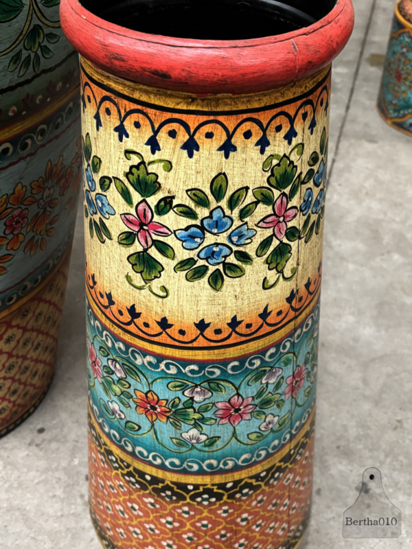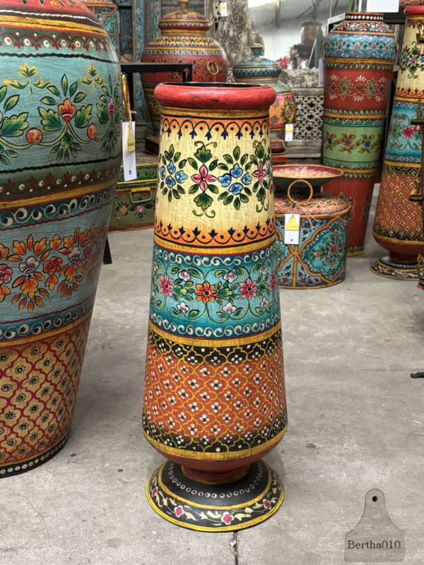 Breng een stukje authentiek Indiaas vakmanschap in je interieur met deze bijzondere handgeschilderde ijzeren vaas.