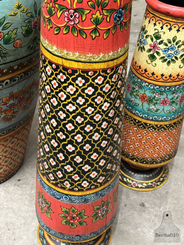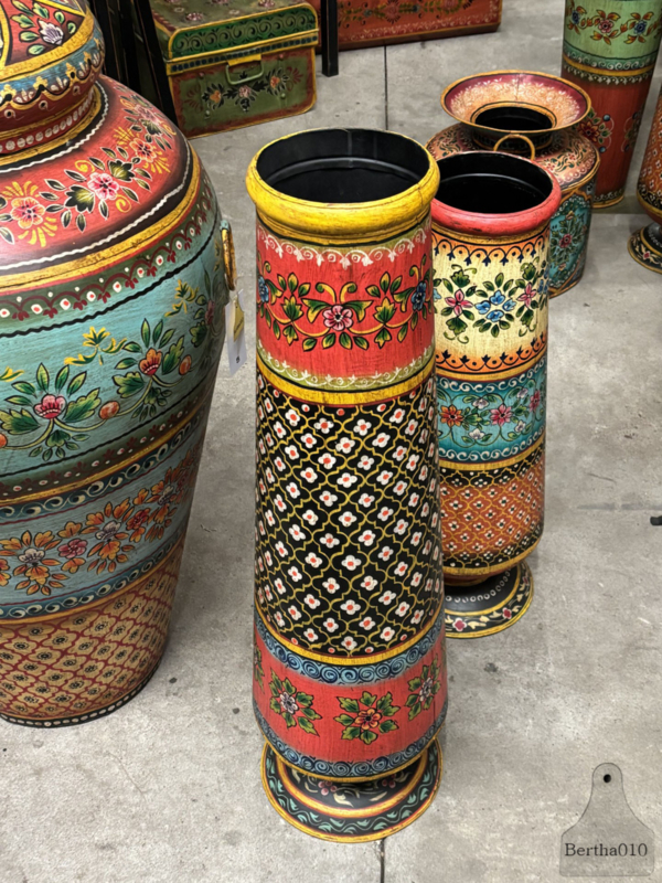Breng een stukje authentiek Indiaas vakmanschap in je interieur met deze bijzondere handgeschilderde ijzeren vaas.
