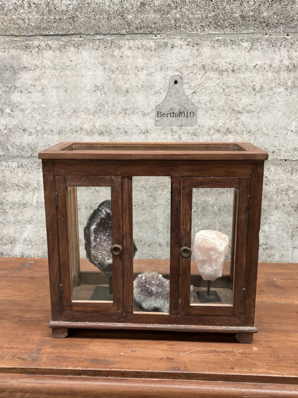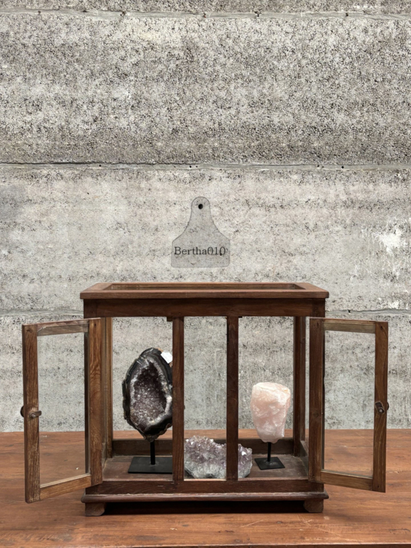 Het heeft een robuuste, industriële uitstraling die vaak gepaard gaat met het gebruik van houten frames en veel glas, wat het ideaal maakte voor het tonen van objecten in een veilige en goed zichtbare manier