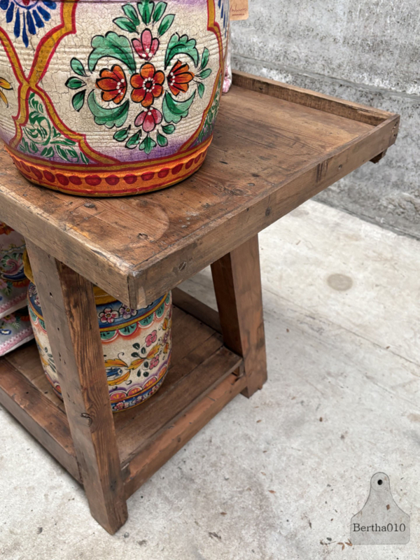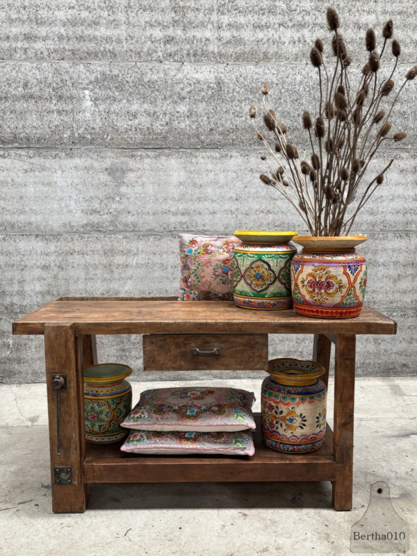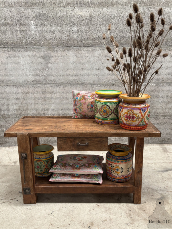 Of je 'm nu gebruikt als badkamermeubel met een stijlvolle waskom, als robuust dressoir in de woonkamer, of als werkoppervlak in een creatieve ruimte, deze werkbank voegt altijd persoonlijkheid en geschiedenis toe aan je interieur.