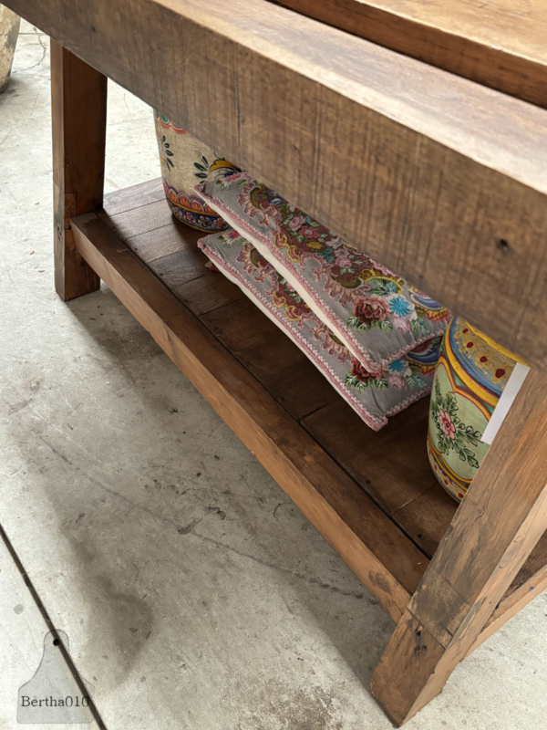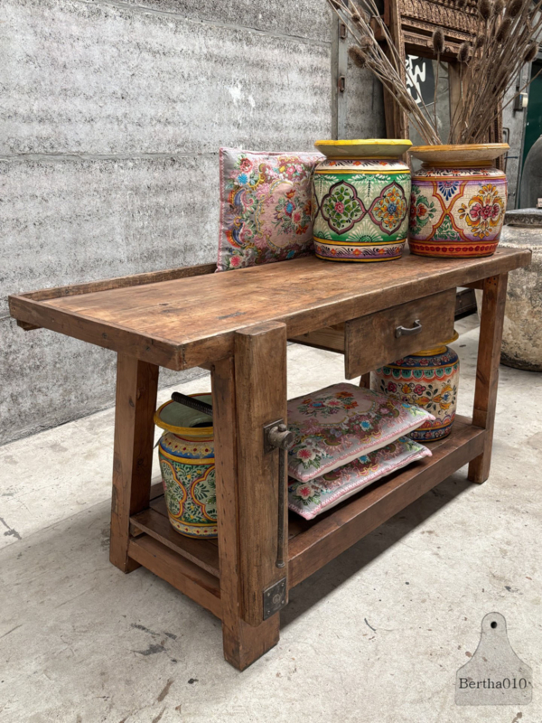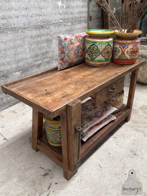 OverzichtPrachtige indrukwekkende, massief houten werkbank: geen standaard meubelstuk, maar een object met ziel. Elke kras, noest en nervenpatroon vertelt zijn eigen verhaal.