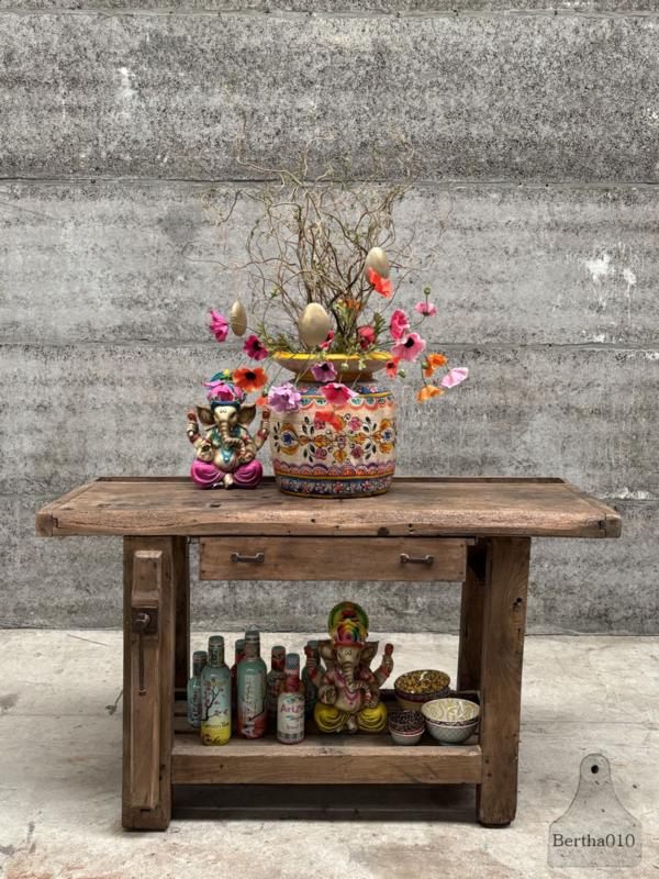 Dankzij het bescheiden formaat en de krachtige uitstraling is deze werkbank een veelzijdig meubel. Perfect als console in de hal, dressoir in de woonkamer, wastafelmeubel, compact bureau of decoratief element in een winkel, studio of horeca-interieur. Een functioneel kunstwerk dat warmte en historie toevoegt aan elke ruimte.