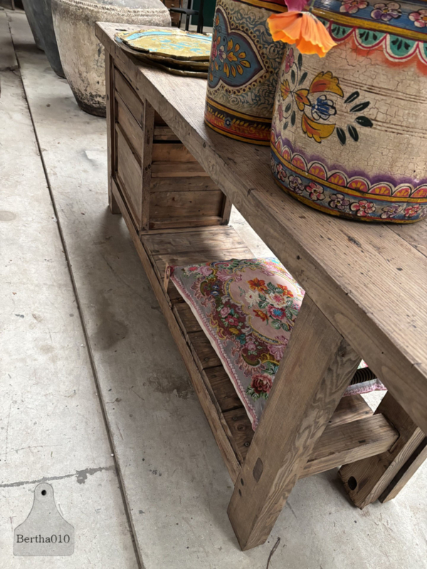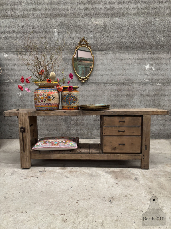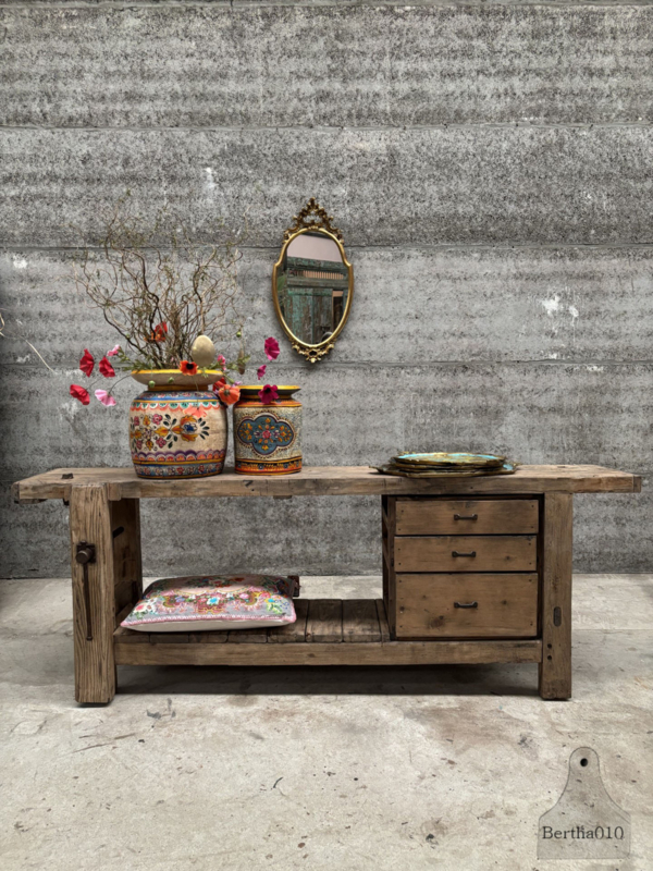 Voorzien van drie goedlopende houten lades is deze werkbank niet alleen een pronkstuk, maar ook functioneel. Perfect als: