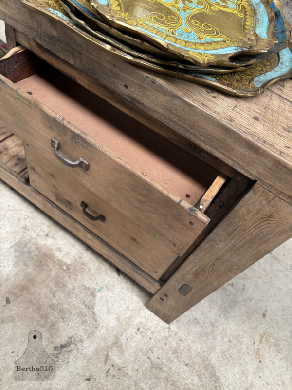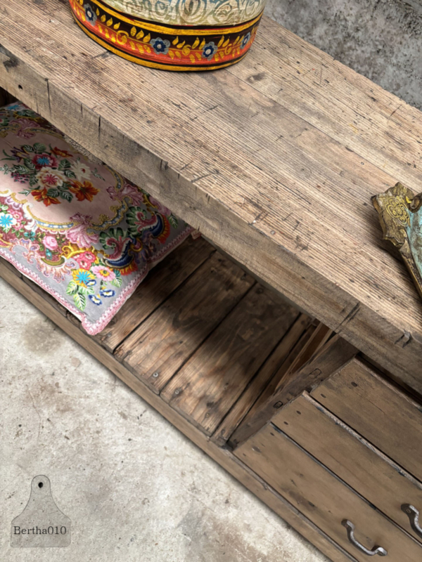 Het massief dikke blad vertelt een verhaal van vakmanschap, gebruik en tijd, een uniek meubel dat kracht en geschiedenis uitstraalt.