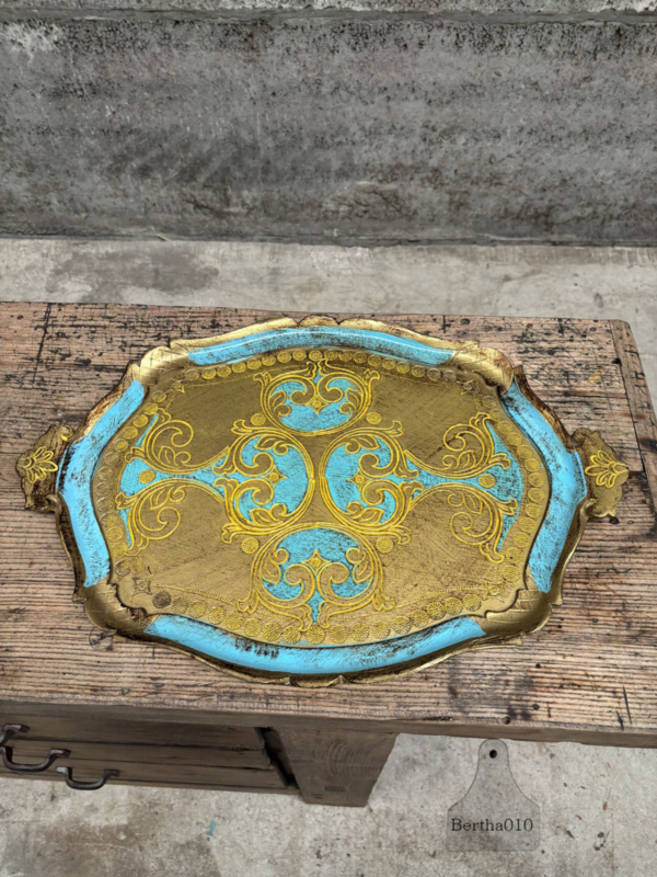 Vintage Florentijns dienblad handbeschilderd hout in goud en lichtblauw 147960