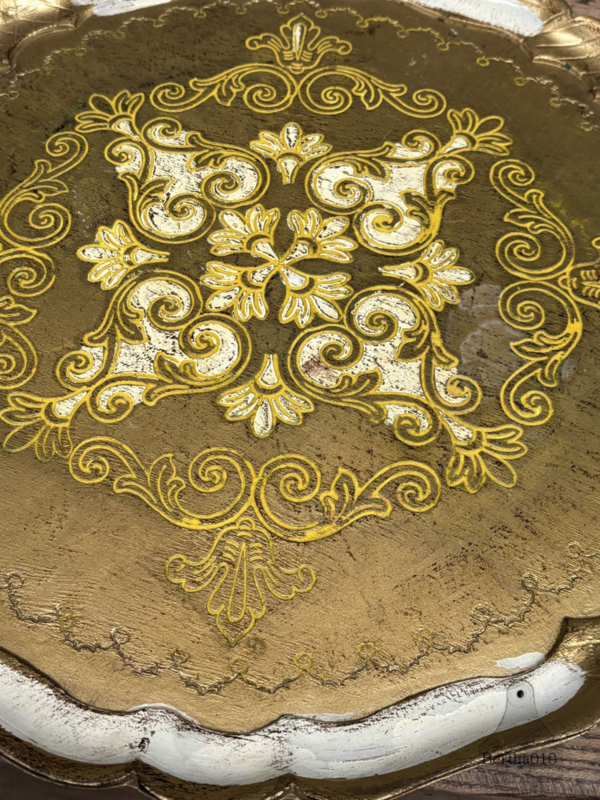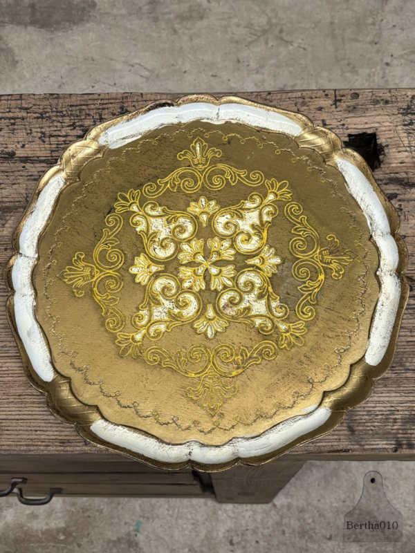 Florentijnse dienbladen werden vooral populair in de midden van de 20e eeuw, met een heropleving van ambachtelijke productie in de jaren 50 en 60. Dit exemplaar weerspiegelt die rijke traditie van Florentijns vakmanschap, die teruggaat tot de 13e eeuw, en laat zien hoe functionele objecten werden omgevormd tot elegante pronkstukken voor in huis.