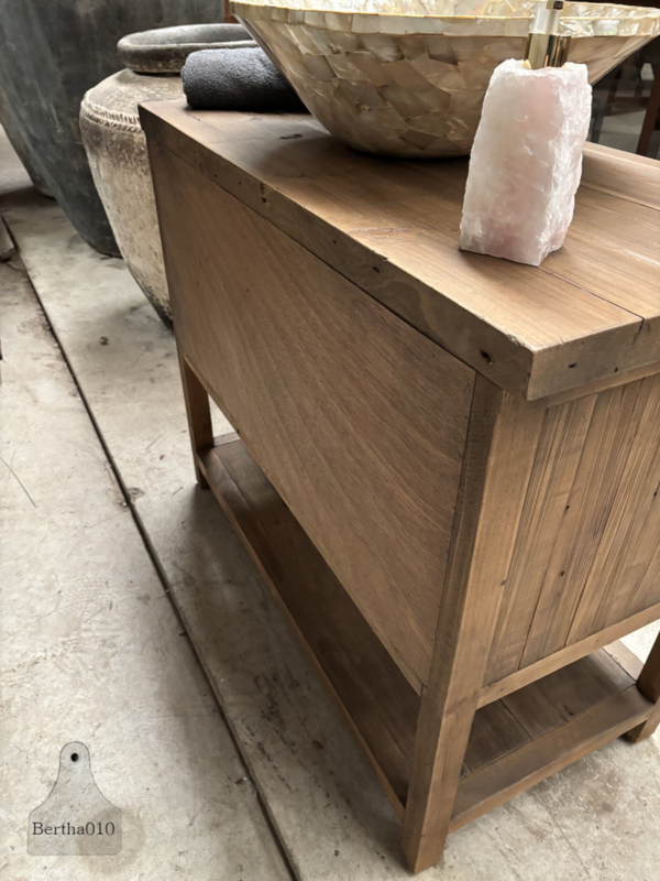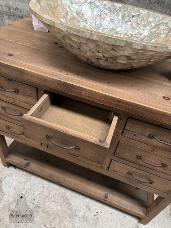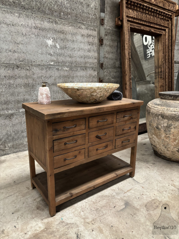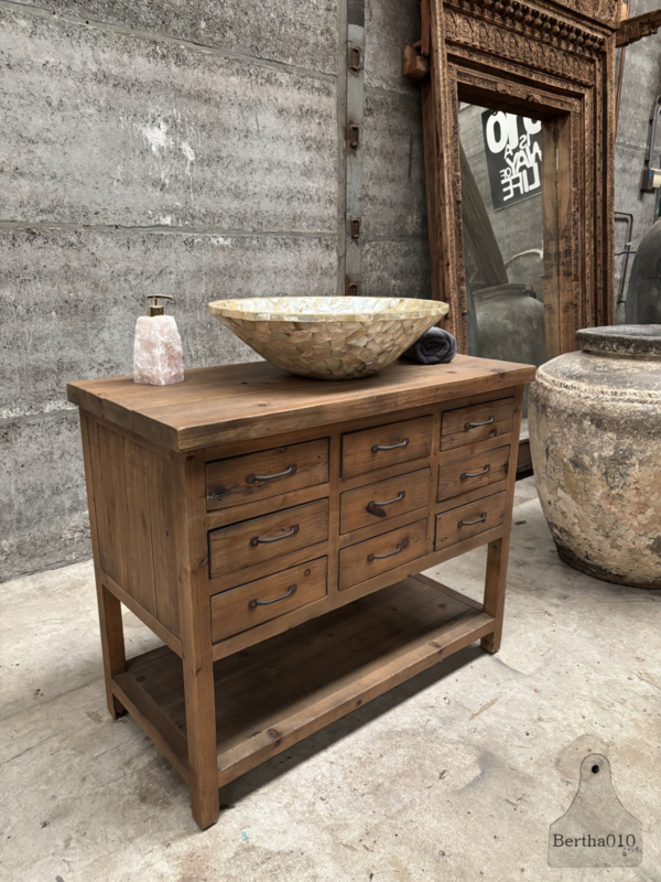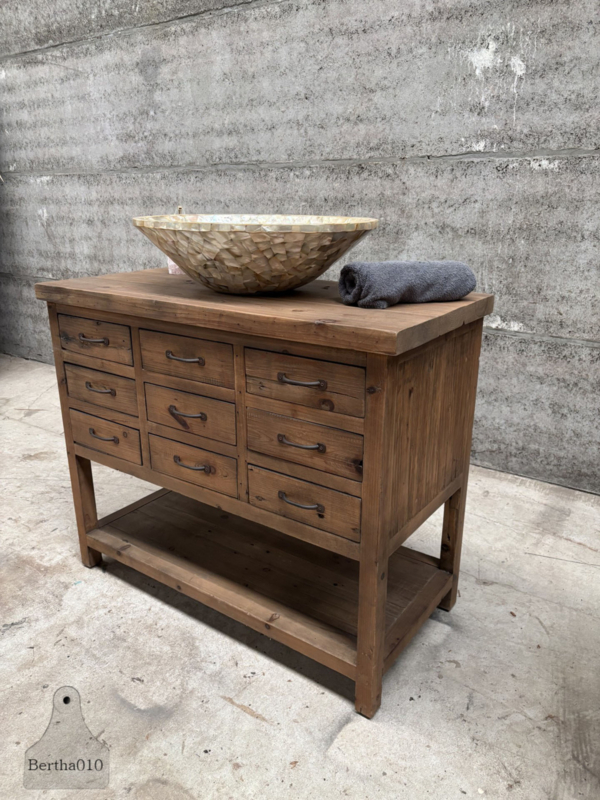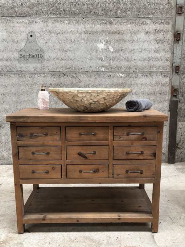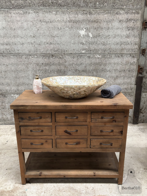 Gebruik hem als een stoer keukenmeubel met extra opbergruimte, een uniek badkamermeubel met ruimte voor een waskom (zoals afgebeeld), of als een opvallend dressoir in uw woonkamer of hal.