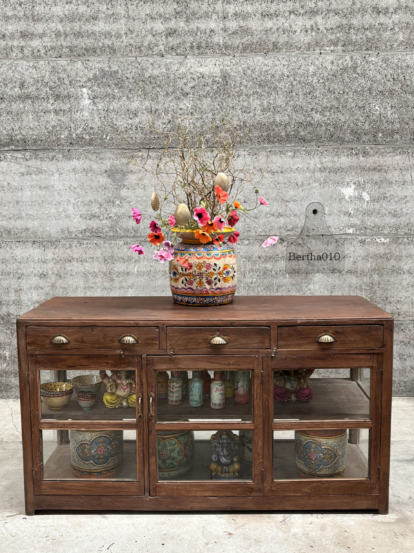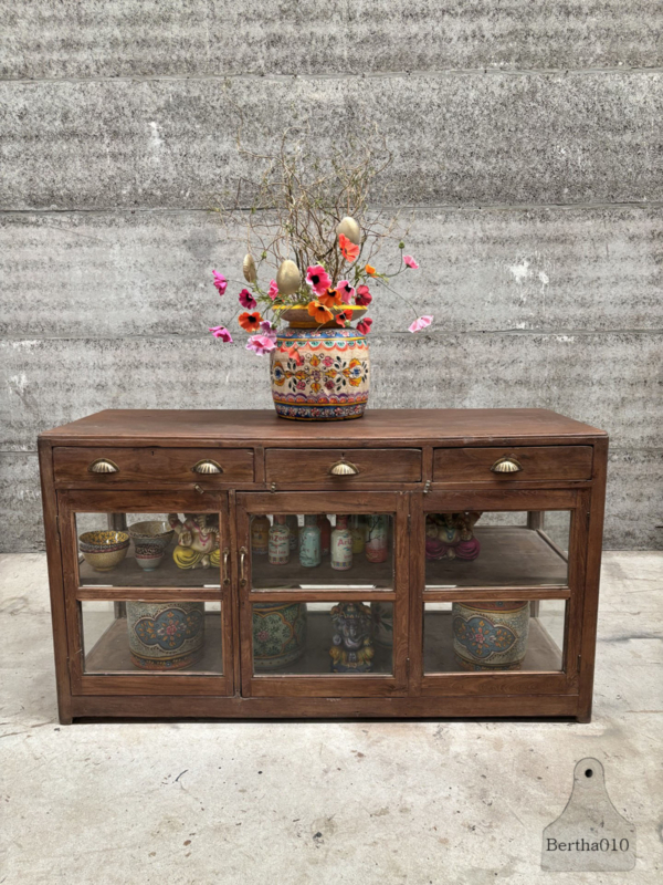 Oorspronkelijk afkomstig uit een oude winkel uit vervlogen tijden, waar hij dienst deed als toonbank. Vandaag de dag brengt dit meubel een ongeëvenaarde sfeer en karakter in ieder interieur. Het prachtige patina, de verfijnde details en de zichtbare geschiedenis maken dit tot veel meer dan een standaard meubel, een echte blikvanger.