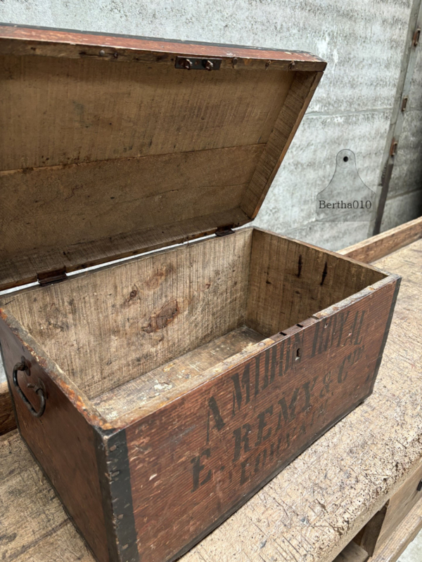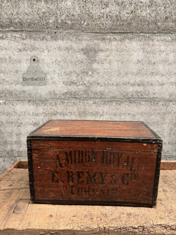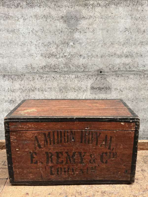 OverzichtIn de afgelopen 10 jaar worden dit soort houten kistjes volop nagemaakt. Hier hebben we te maken met een origineel exemplaar afkomstig uit Louvain (Leuven) uit Belgie van firma Amidon Royal. De (verschepings)kist is gemaakt voor het vervoer van stijfsel. Datum 1900-1930.