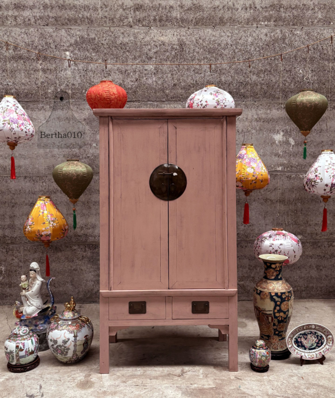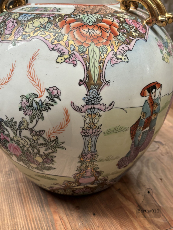 De vaas vertelt een rijk visueel verhaal, aan de ene zijde een floraal tafereel met paradijsvogels en aan de andere zijde een elegant gedetailleerde vrouwenfiguur in traditionele kledij.