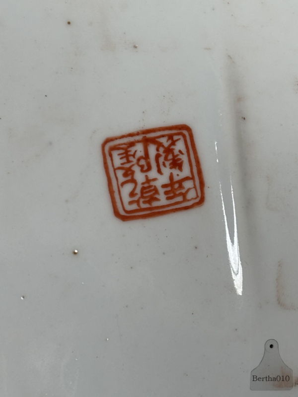 De onderzijde van het bord draagt een karakteristiek rood zegelmerk met de naam van Keizer Qianlong (1736-1795). Dit is een zogenaamd 'eerbetoon-merk', in de 20e eeuw aangebracht als teken van respect voor de hoogtijdagen van de Chinese kunst. Het vertelt de koper dat dit object is gemaakt volgens de strenge kwaliteitseisen en de overdadige stijl die destijds aan het keizerlijk hof geliefd waren.