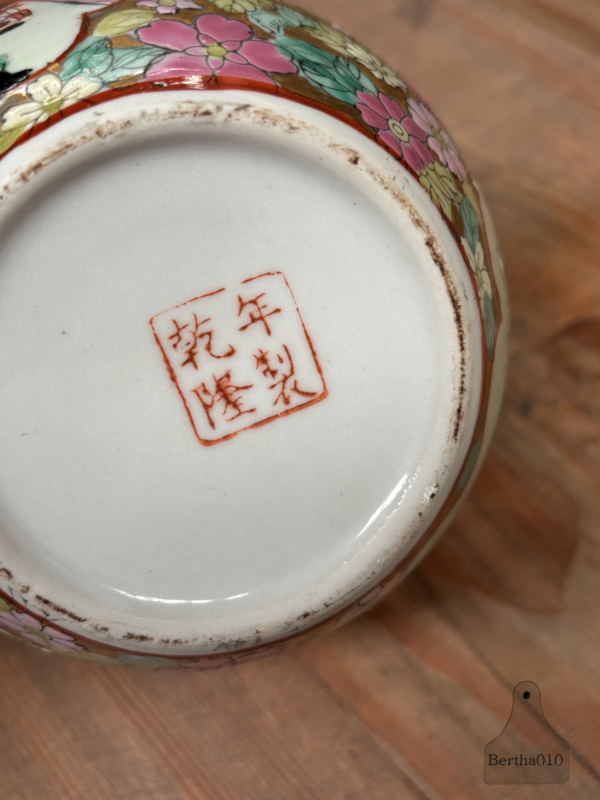 Aan de onderzijde prijkt het rode Qianlong-zegelmerk. Hoewel de pot uit de 20e eeuw komt, dient dit merk als een kwaliteitszegel en een eerbetoon aan de 'Gouden Eeuw' van het Chinese porselein (1736-1795). Het vertelt het verhaal van een tijd waarin kunst en perfectie de hoogste prioriteit hadden.