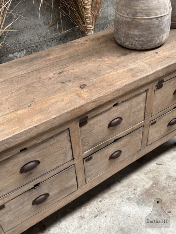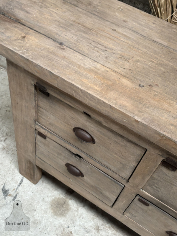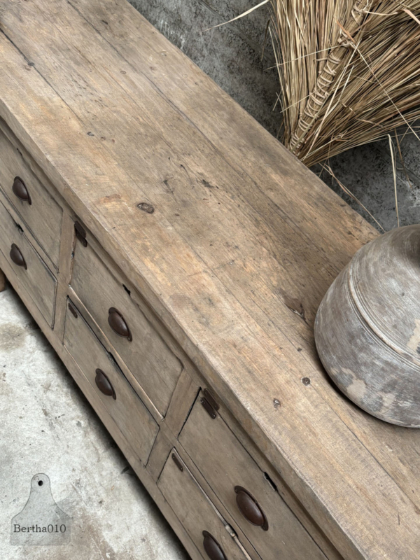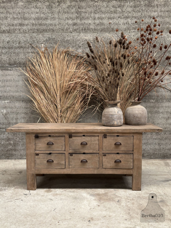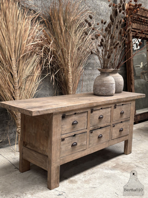 Dit meubel is met zijn zes goedlopende diepe laden niet alleen een lust voor het oog, maar ook een toonbeeld van functionaliteit. Het massieve hout vertelt een verhaal van jarenlang ambacht en heeft door de tijd heen een prachtige, matte patina gekregen die in elk modern of landelijk interieur tot zijn recht komt.