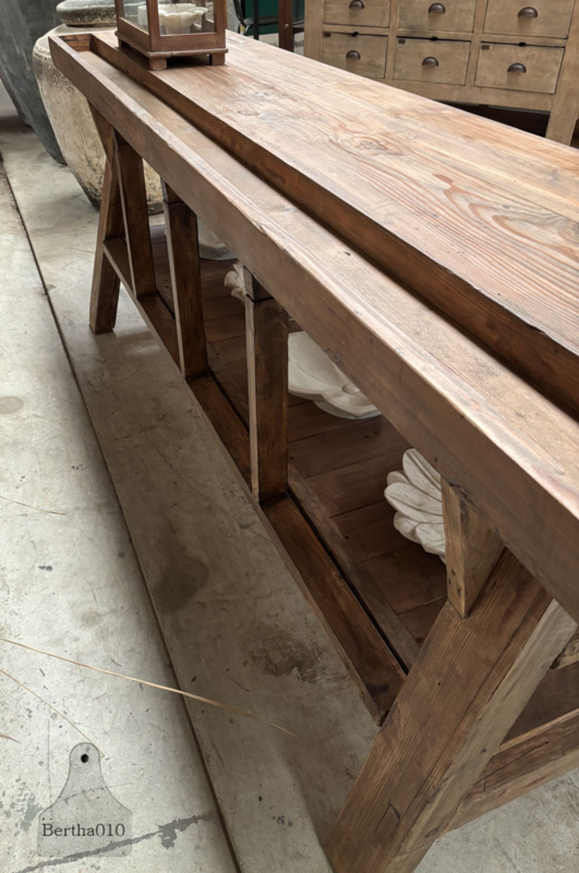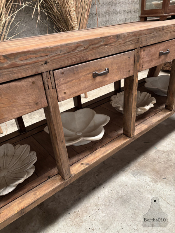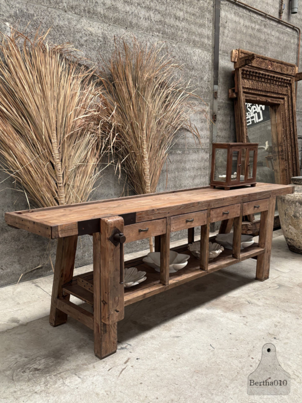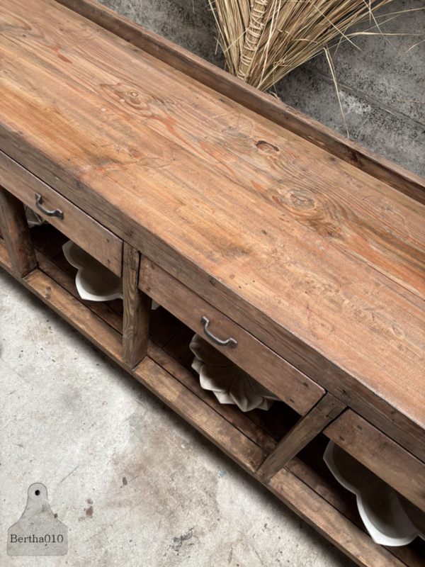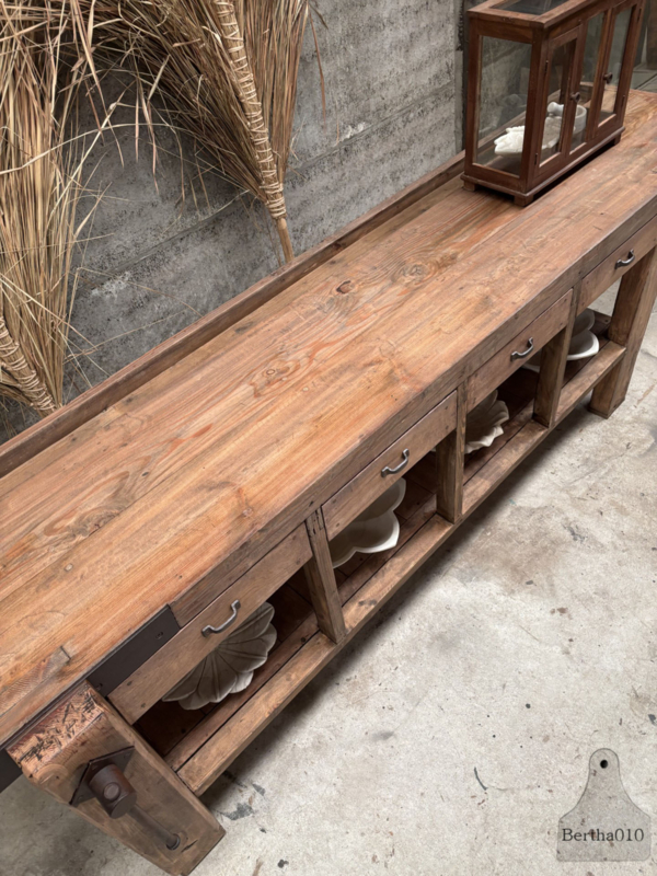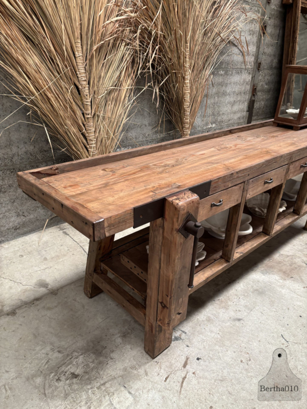 Lange oude werkbank met 4 laden 147978 lengte 260 cm