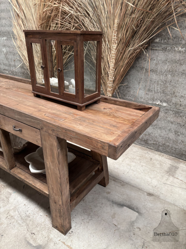De werkbank is gecoat, behandeld en direct gebruiksklaar. Te gebruiken als keukeneiland, dressoir of badkamermeubel.